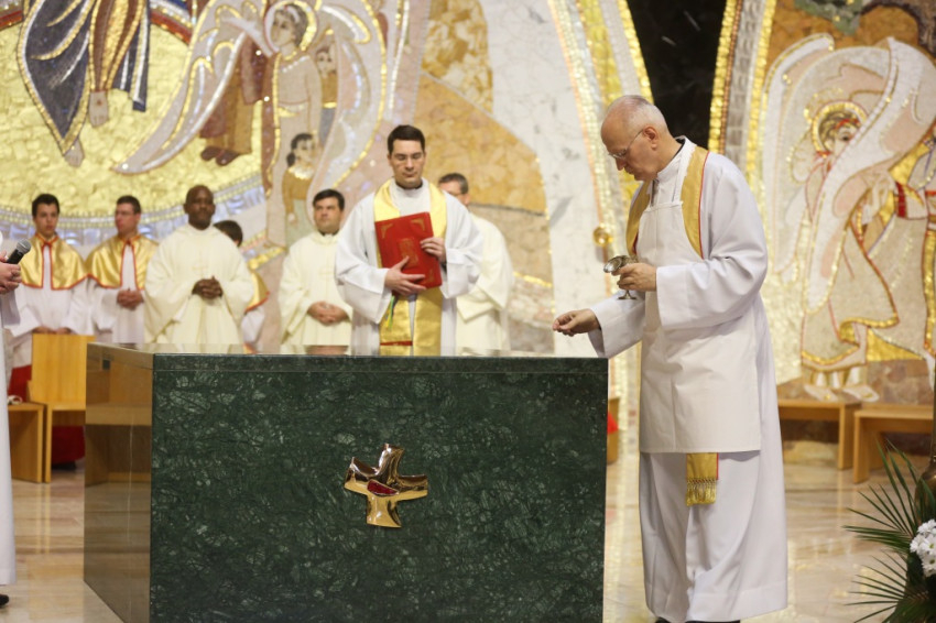A hívek könyörgései és a Mindenszentek litániája után a bíboros megkente olajjal az oltárt, majd Cserháti Ferenc segédpüspök és az apostoli nunciatúra titkára a templom falait kenték meg tizenkét helyen. Erdő Péter az oltáron meggyújtotta a tömjént, és körbefüstölte vele a templomot. Miután az oltárt megterítették és a gyertyákat meggyújtották, az áldozati liturgiával folytatódott a szertartás.