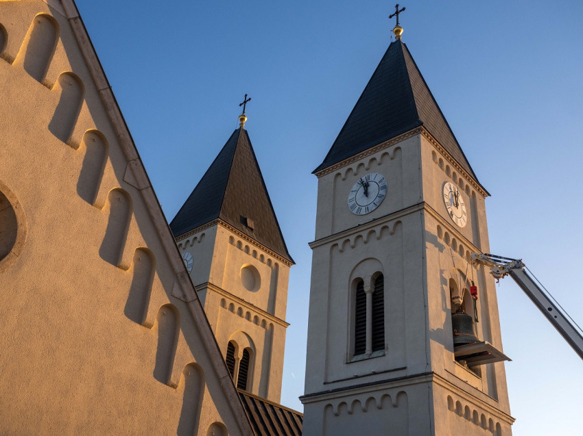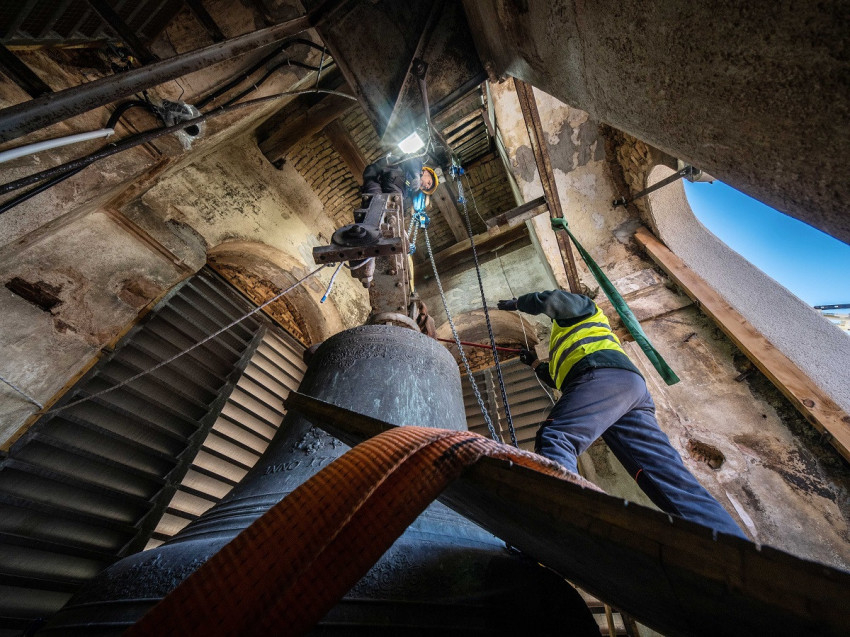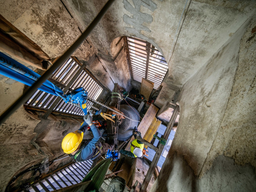 „A harangot lényegében középkori módszerekkel kellett eljuttatnunk a torony közepéből az ablakig, és onnan a daruig. A harangszék alá készült egy acélszerkezet, amelyre a harangot csörlővel, kézi hajtással emeltük rá. Ezután egy speciális görgősoron, centiméterenként juttattuk el a nagyharangot a főszékesegyház egyik toronyablakához, onnan pedig a daru horgához” – mondta Most Balázs.