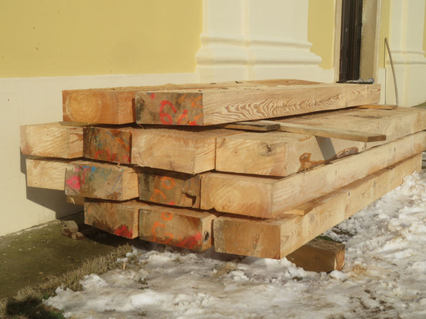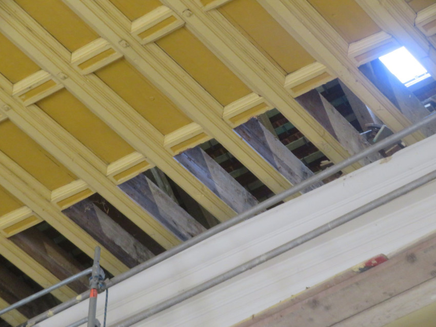 A munkálatok során előbb elbontják a födém deszkaborítását, majd kicserélik a károsodott gerendavégeket, és megnövelt teherbírású acélszerelvényt építenek a fagerenda tetejére.