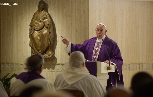 A pápa a napi szentírási idézetek, Izajás próféta és a Máté-evangélium szavai nyomán még egyszer elmagyarázta a beszéd és a cselekvés evangéliumi dialektikáját. Jézus leleplezi az írástudók és farizeusok képmutatását, és arra szólítja tanítványait és a tömeget, hogy azt kövessék, amit tanítanak, de ne úgy viselkedjenek, mint ők.