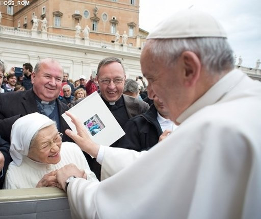 A pápai katekézist követően a Magyar Katolikus Karitász igazgatója, Écsy Gábor átadta a pápának azt a fényképalbumot, amely a Magyarországon átvonuló menekültek között végzett munkájukat dokumentálja.