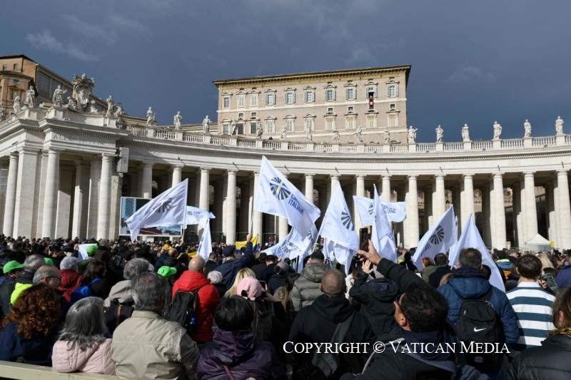 Ma az olasz plébániákon a Katolikus Akció tagjai megújítják elköteleződésüket. Minden tagnak jó utat kívánok a képzéshez, a szolgálathoz és az apostoli tevékenységhez. Szívből adom áldásomat a Rocca di Papa-i hívekre és a fáklyára, amellyel meggyújtják majd a nagy csillagot gyönyörű városuk erődjén, a Szeplőtlen Mária tiszteletére. Lélekben közel állok a sienai, fabrianói és Ascoli Picenó-i munkásokhoz, akik szolidárisan védik a munkához való jogot, amely a méltósághoz való jog! Ne vegyék el tőlük a munkájukat gazdasági vagy pénzügyi okokból!