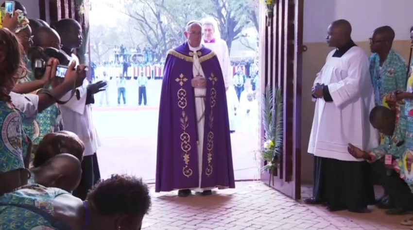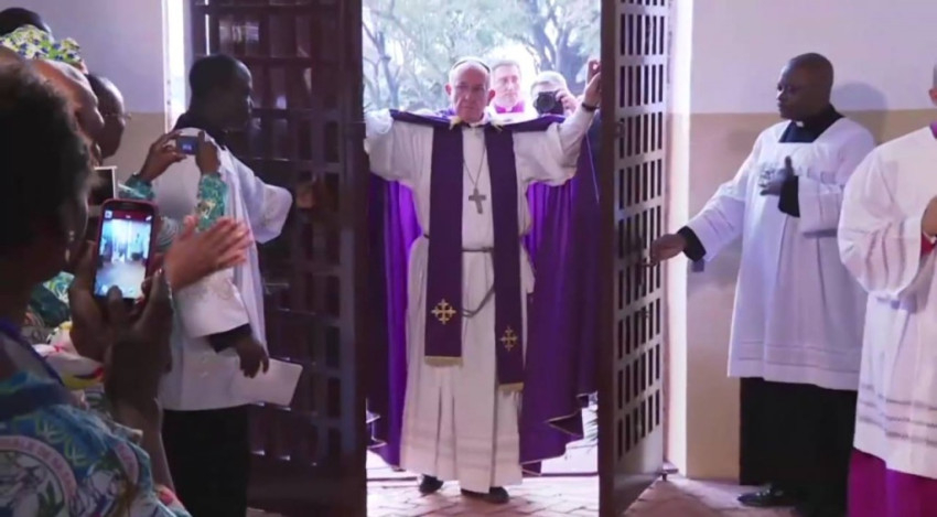 „Ma Bangui a világ lelki fővárosává vált. Az irgalmasság szentéve korábban kezdődik ezen a földön, mely sok éve szenved a háborútól, a gyűlölettől, a megértés és a béke hiányától. És ezen a szenvedő földön most ott áll minden olyan ország, mely a háború keresztjét hordozza. Bangui az Atya irgalmasságáért való ima lelki fővárosává vált. Mindnyájan kérjünk békét, irgalmasságot, kiengesztelődést, megbocsátást és szeretetet. Banguiért, a Közép-afrikai Köztársaságért, az egész világért és a háborútól szenvedő országokért kérjük a békét! Mindnyájan együtt kérjünk szeretetet és békét. Mindnyájan együtt! Doyé Siriri! [szango nyelven: Szeretet és Béke]” – Ferenc pápa ezekkel a szavakkal nyitotta meg a rövidesen kezdődő irgalmasság rendkívüli szentévének első szent kapuját Afrikában, az évek óta polgárháborútól szenvedő Közép-afrikai Köztársaság fővárosában.