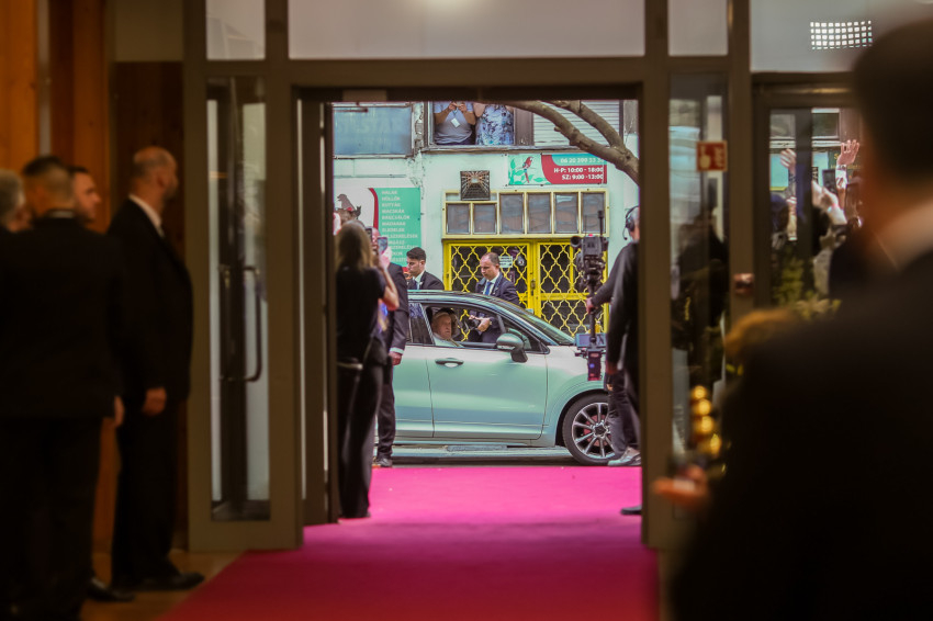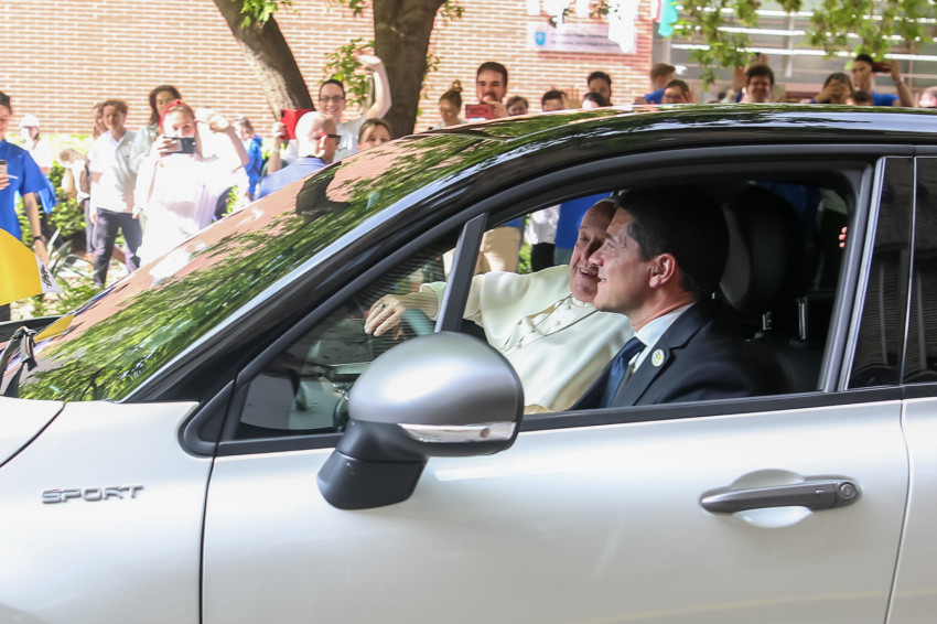 A Szentatyát az egyetem bejáratánál Kuminetz Géza, a PPKE rektora és Cserey György, a kar dékánja fogadta, majd bekísérték az épületbe, és együtt léptek a pódiumra.