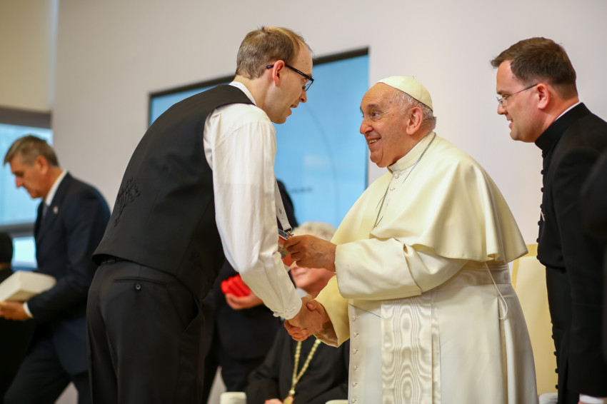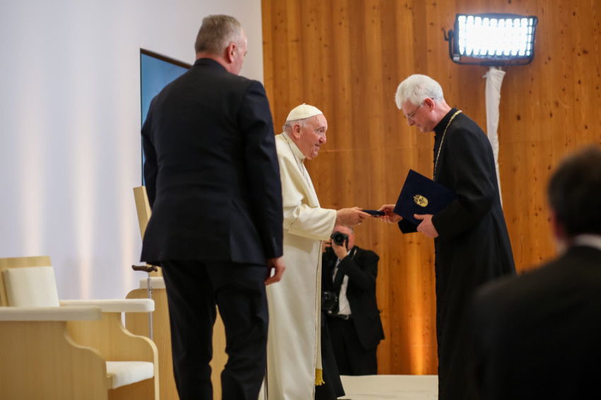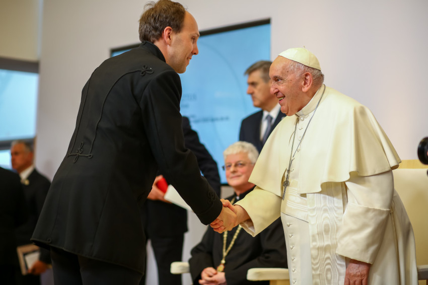 A beszéd után Kuminetz Géza rektor átadta a Szentatyának az egyetem ajándékát: egy különleges rózsafüzért, melyet a Tasi Benedek kutató-fejlesztő mérnök csapata által kifejlesztett programozható fonógép készített. Majd a jelenlévők együtt elmondták az Úr imáját, a Miatyánkot, és Ferenc pápa Isten áldását kérte a jelenlévőkre.
