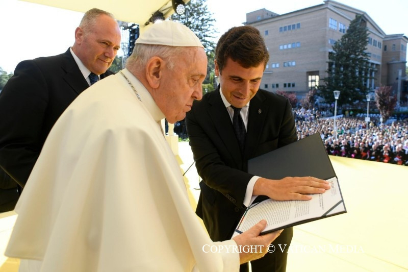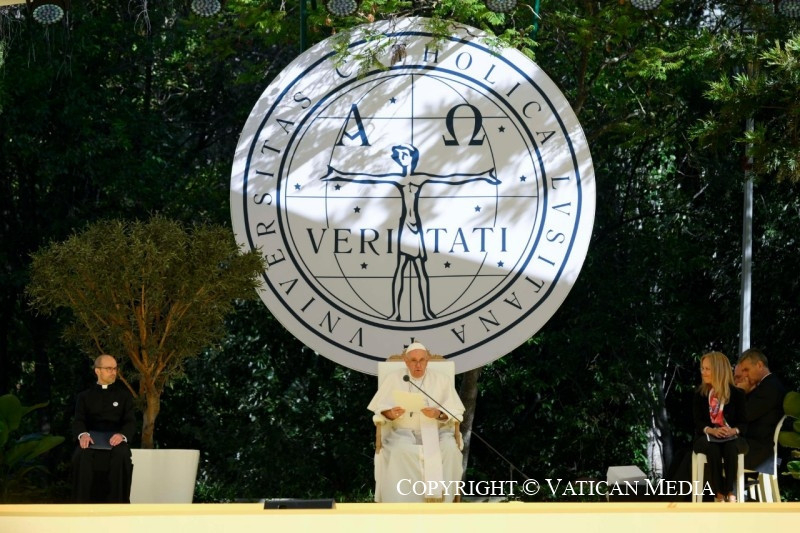 Barátaim, nagy örömmel látom, hogy élő nevelő közösség vagytok, mely nyitott a valóságra, és tudatában van annak, hogy az evangélium nem puszta dísz, hanem életet ad a részeknek és az egésznek. Tudom, hogy képzési tervetek több területet foglal magában: tanulmányok, barátság, társadalmi szolgálat, polgári és politikai felelősségvállalás, a közös otthonról való gondoskodás, művészi kifejezésmódok. Katolikus egyetemnek lenni mindenekelőtt ezt jelenti: hogy minden összetevő kapcsolatban áll az egésszel, és hogy az egész a részekben található. Ily módon a tudományos ismeretek elsajátítása mellett az ember személyként, önmaga megismerésében és saját útjának felismerésében is érik. Útról lehet szó, labirintusról nem! Csak így tovább!