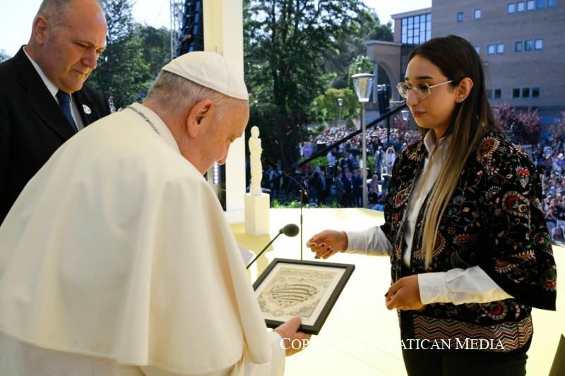 Köszönöm, Tomás, hogy azt mondtad: „Isten nélkül nem lehetséges valódi átfogó ökológia”, és „nem lehet jövő egy Isten nélküli világban”. Azt szeretném kérni tőletek, hogy a hitet döntéseitekkel tegyétek hitelessé. Mert ha a hit nem szül meggyőző életmódot, akkor nem keleszti meg a világ tésztáját. Nem elég meggyőződött kereszténynek lenni, meggyőzőnek is kell lennünk. Tetteinknek tükrözniük kell az evangélium – örömteli és radikális – szépségét. Továbbá a kereszténységet nem lehet úgy felfogni, mint egy fallal körülvett erődöt, mely bástyaként áll a világgal szemben. Ezért nagyon elgondolkodtatónak találtam Beatriz tanúságtételét; azt mondta, úgy érzi, hogy éppen „a kultúra közegéből kiindulva” kell megélnie a boldogmondásokat. Minden korban a keresztények egyik legfontosabb feladata, hogy visszanyerjék a megtestesülés értelmét. A megtestesülés nélkül a kereszténység ideológiává válik – és a „keresztény ideológiák” kísértése ma erősen jelen van. A megtestesülés teszi lehetővé számunkra, hogy elámuljunk azon a szépségen, amelyet Krisztus minden egyes testvérünkön és nővérünkön, minden egyes férfin és nőn keresztül feltár előttünk.