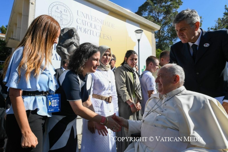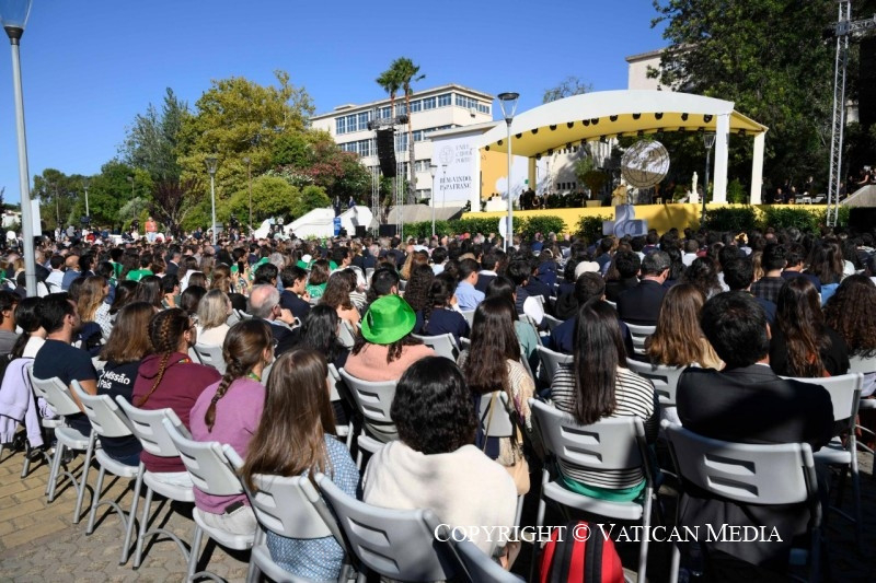 Beatriz, Mahoor, Mariana és Tomás, köszönöm tanúságtételeteket; mindegyikben a remény hangja hallatszott, reális lelkesedéssel, nem volt bennük panaszkodás, sem illuzórikus előremenekülés. Ti főszereplők akartok lenni, „a változás főszereplői”, ahogy Mariana mondta. Titeket hallgatva eszembe jutott José de Almada Negreiros író egyik mondata, mely talán ismerős lehet nektek: „Olyan országról álmodtam, ahol mindenki tanárrá vált” (A Invenção do Dia Claro [Rátalálni a fényes napra]).