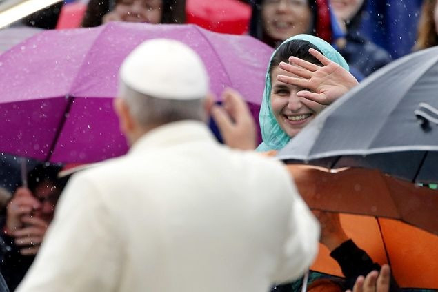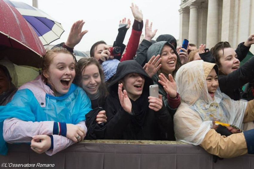 Jó napot! Bár nincs valami szép napunk, ugye? Ma a kihallgatást két különböző helyen tartjuk – mindig így csináljuk, amikor esik az eső –, ti itt, a téren, sok beteg pedig a VI. Pál-teremben, ők kivetítőkön követik a kihallgatást. A testvériség jeleként köszöntsük őket tapssal! Ugye, nem is könnyű esernyővel a kézben tapsolni?