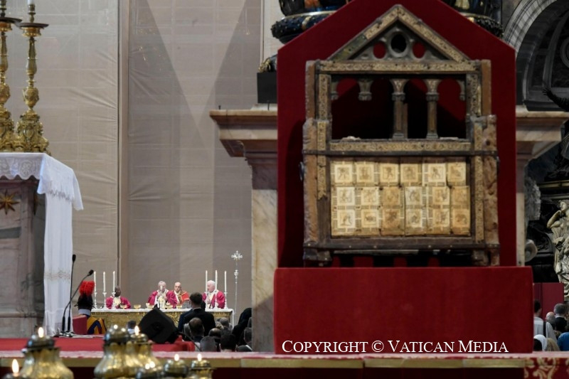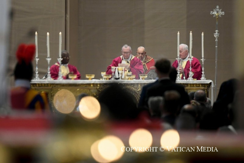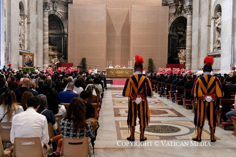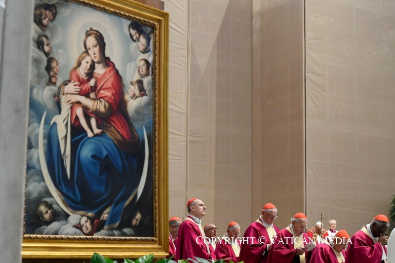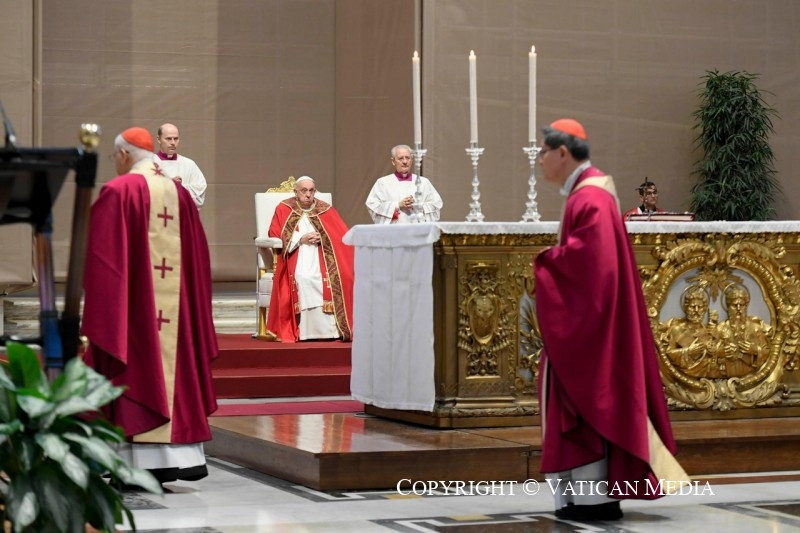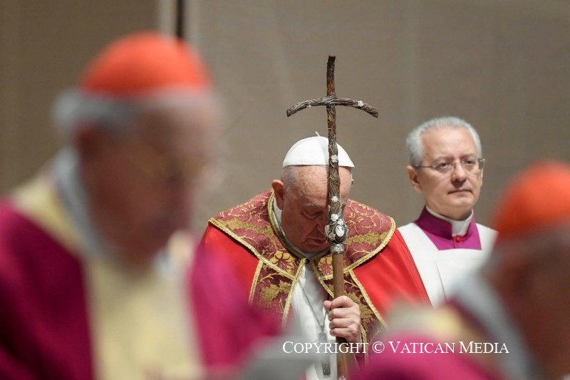 Kedves testvéreim, Isten szívéhez fordulva a ma élő emberek és minden idők emberei is remélhetik az üdvösséget, még akkor is, ha „az esztelenek szemében úgy látszott, hogy meghaltak” (Bölcs 3,2). Az Úr emlékezete ugyanis megőrzi az egész történelmet. Az emlékezés őrzés. Ő a történelem együttérző és irgalmas bírája. Az Úr mint bíró közel van hozzánk; közeli, együttérző és irgalmas. Ez az Úr három magatartása. Én közel állok-e az emberekhez? Együttérző-e a szívem? Irgalmas vagyok-e? Ezzel a hittel imádkozzunk az elmúlt tizenkét hónapban elhunyt bíborosokért és püspökökért! Emlékezésünk ma imádsággá válik testvéreink lelki üdvéért. Isten népének kiválasztott tagjai ők, akik alámeríttettek Krisztus halálába (vö. Róm 6,3), hogy vele együtt feltámadjanak. Az Úr nyájának pásztorai és példaképei voltak (vö. 1Pét 5,3): hadd üljenek most az ő asztalához, miután a földön részesedtek az élet kenyeréből! Szerették az Egyházat, ki-ki a maga módján, de mindannyian szerették az Egyházat: imádkozzunk, hogy örökké élvezhessék a szentek társaságát! Mi pedig szilárd reménységgel várjuk, hogy velük együtt örvendezhessünk a paradicsomban. Most pedig arra kérlek benneteket, hogy mondjátok velem együtt háromszor: „Jézus, emlékezz meg rólunk!” Mondjuk mindannyian! „Jézus, emlékezz meg rólunk!” „Jézus, emlékezz meg rólunk!” „Jézus, emlékezz meg rólunk!”