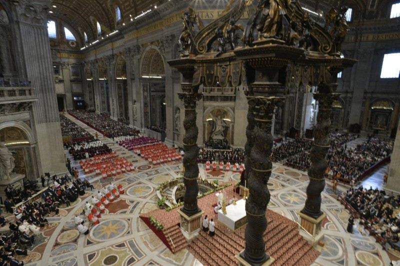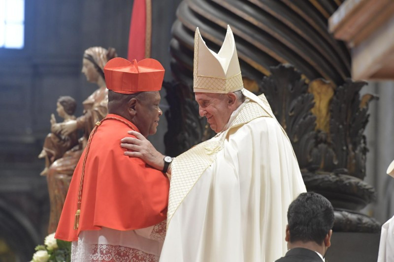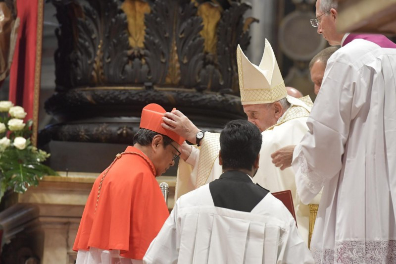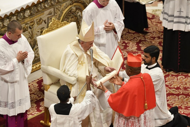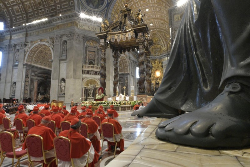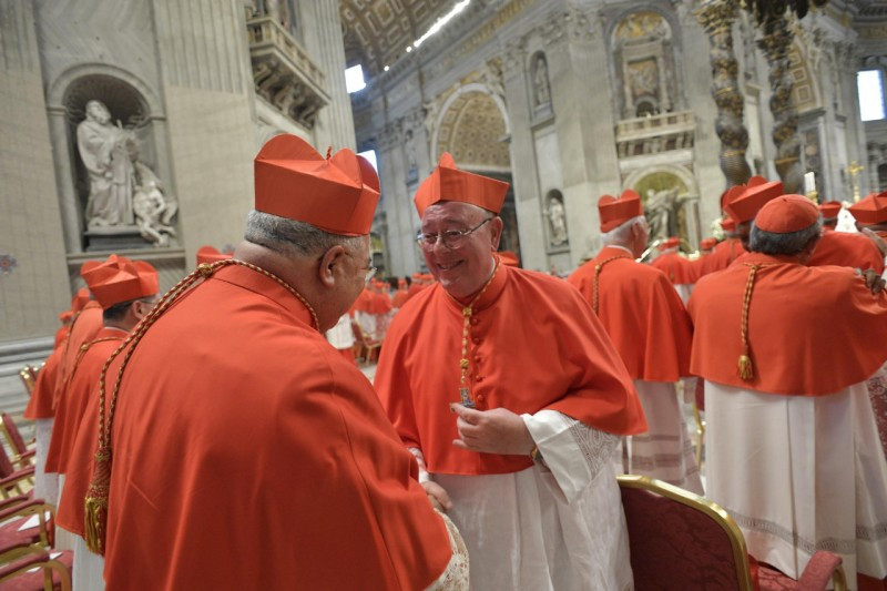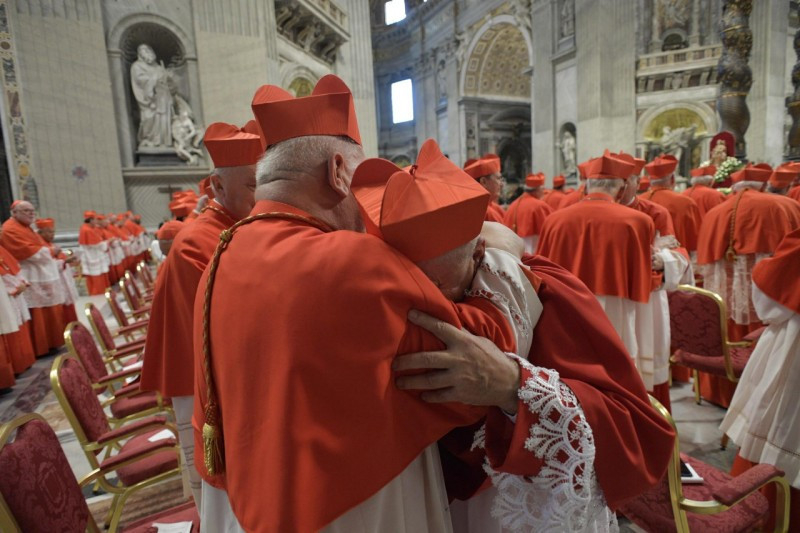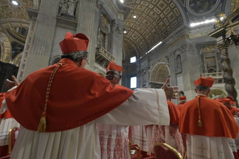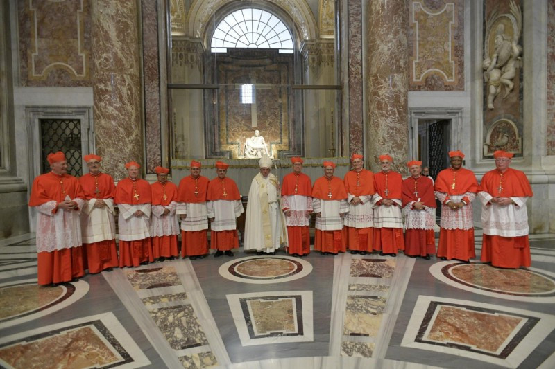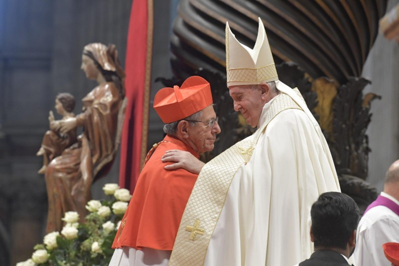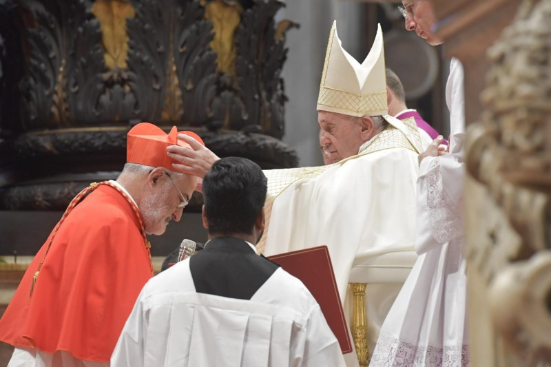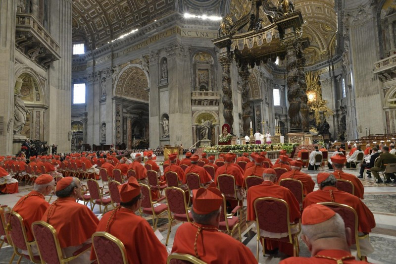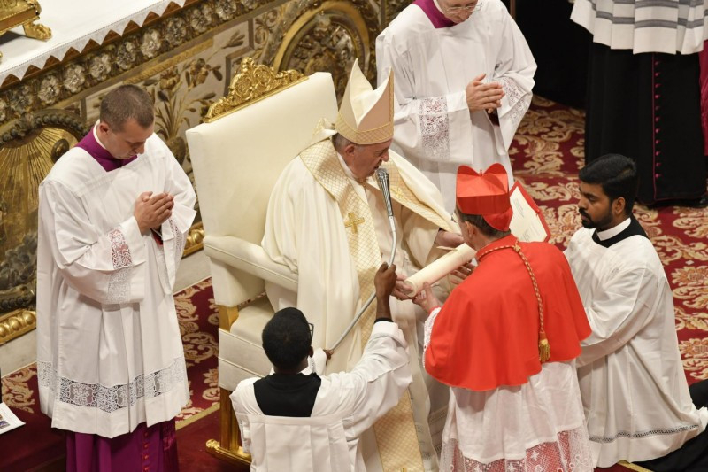Ezen a ponton feltehetjük magunknak a kérdést: tudjuk-e, elsőként mi, hogy Isten együttérzésének tárgyai voltunk? Főképp hozzátok szólok, bíboros testvérek, és akik nemsokára bíborosok lesztek: eleven-e bennetek ez a tudatosság? Az, hogy mindig megelőzött és mindig kísért bennünket az ő irgalma? Ez a tudatosság volt Szűz Mária szeplőtelen szívének állandó állapota, aki dicsérte Istent mint „megmentőjét”, aki „letekintett szolgálójának kicsinységére” (Lk 1,48).
