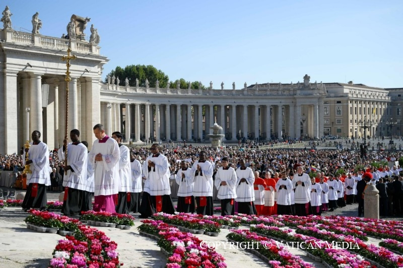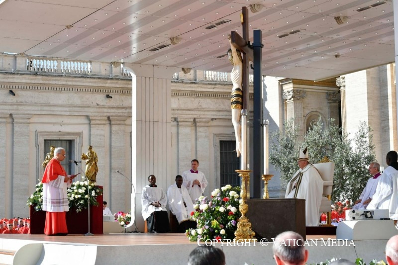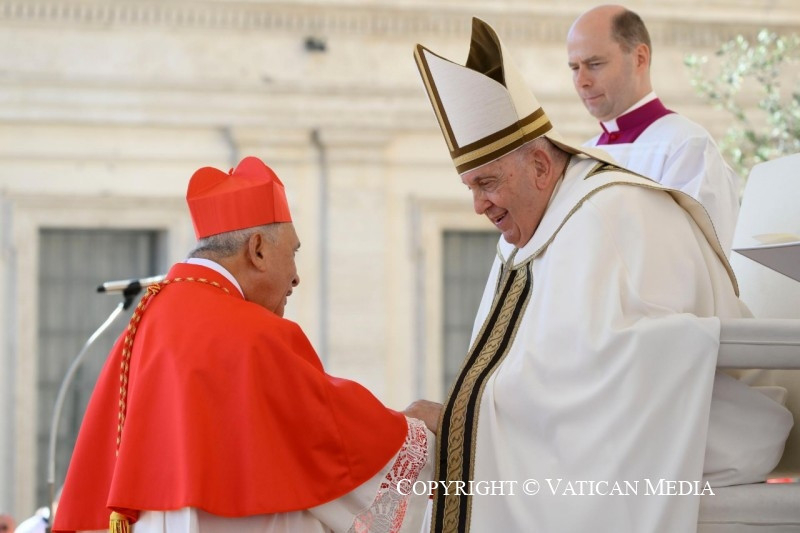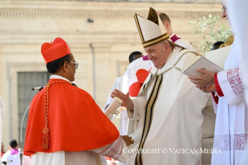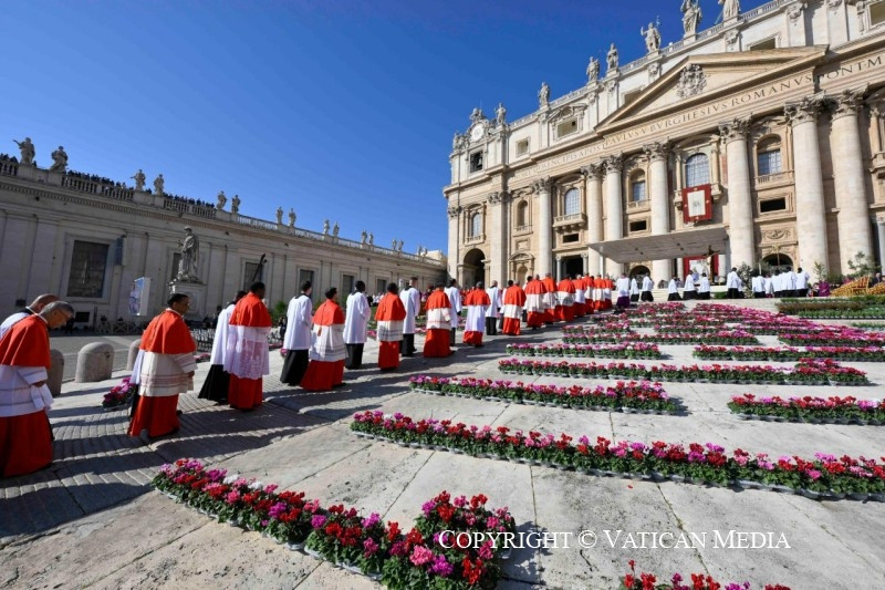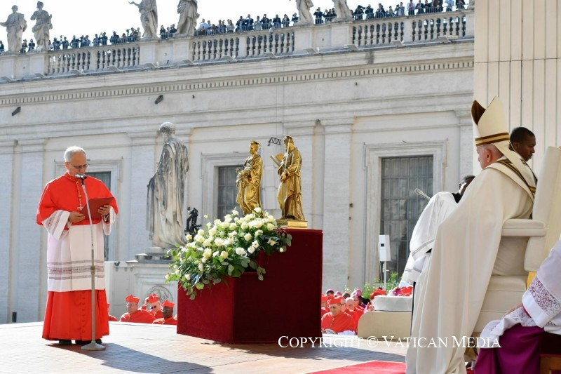 Nem „járadékból” él, nem, még kevésbé régészeti örökségből, bármilyen értékes és nemes is legyen az. Az Egyház – és minden megkeresztelt személy – a Szentlélek működése által Isten mai napjából él. A most itt végzett cselekedetnek is akkor van értelme, ha a hitnek ebben a perspektívájában éljük meg. És ma Isten igéjének fényében felismerhetjük ezt a valóságot: ti, új bíborosok, a világ különböző részeiről érkeztetek, és ugyanaz a Lélek, amely megtermékenyítette népeitek evangelizációját, most megújítja bennetek az Egyházban és az Egyházért kapott hivatásotokat és küldetéseteket.