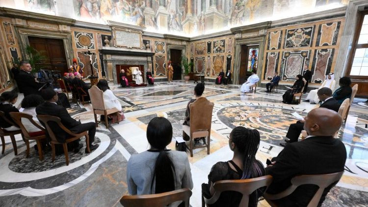 Ha a család képét a nemzetközi közösségre vonatkoztatjuk, az helytálló, mert a család alkotja az élet elsődleges helyét és azt a teret, ahol a szeretet, a testvériség, az együttélés, a megosztás, a másik iránti figyelem és a gondoskodás értékeit átadják. A diplomácia feladata ezeknek az értékeknek a fenntartása, melyek elengedhetetlenek a személy átfogó fejlődéséhez és a népek gyarapodásához, különösen olyan nehéz körülmények között, mint ami most Szudánban, Ukrajnában, a Gázai övezetben és Haitin tapasztalható.