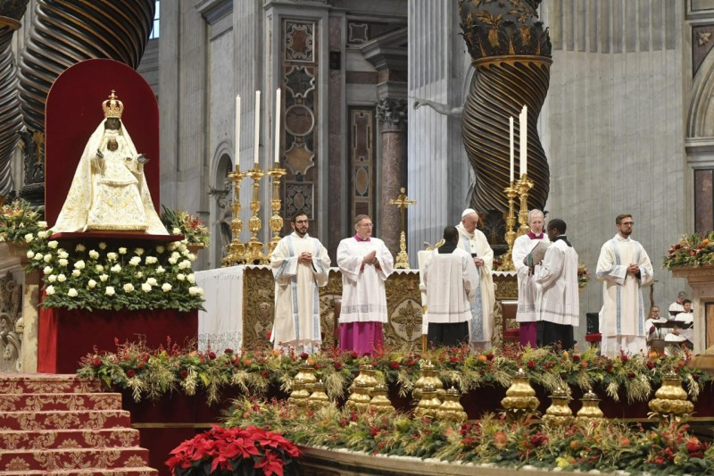 Ha az Egyház közeledik Máriához, akkor újra rátalál önmagára, visszatalál középpontjához és egységéhez. Az emberi nem ellensége, az ördög viszont próbálja megosztani, előtérbe helyezni a különbözőségeket, az ideológiákat, az egy-egy oldal által képviselt gondolatokat és a pártokat. De nem értjük az Egyházat, ha a struktúrákból, a programokból, a trendekből, az ideológiákból, a szerepekből kiindulva nézzük: megragadunk belőle valamit, de nem az Egyház szívét. Mert az Egyháznak anyai szíve van. És mi, gyermekei, ma megszólítjuk Isten anyját, aki hívő népként egyesít minket. Ó, anyánk, ébressz reményt bennünk, hozd el nekünk az egységet! Üdvösség asszonya, rád bízzuk ezt az évet, őrizd meg szívedben! Köszöntük téged: Isten szent anyja! Álljunk fel, és mindnyájan együtt köszöntsük a Szűzanyát, mondjuk háromszor: Isten szent anyja! [A hívőkkel közösen:] Isten szent anyja, Isten szent anyja, Isten szent anyja!