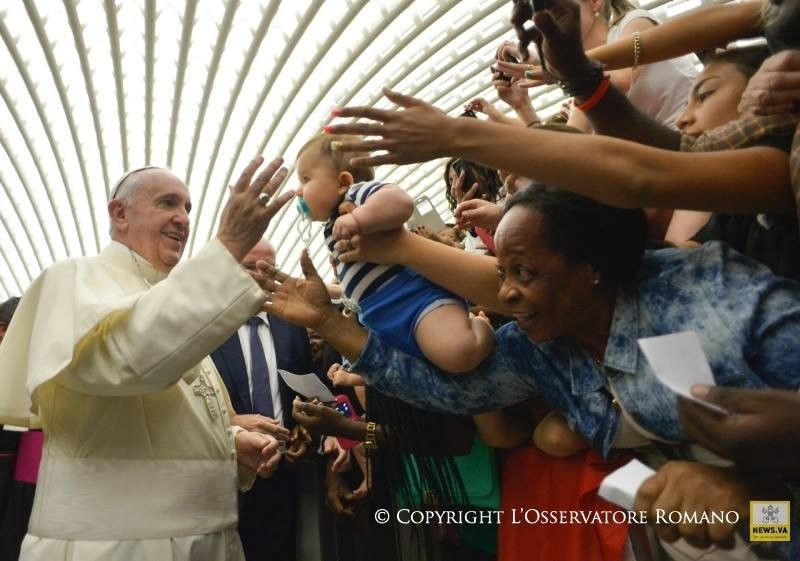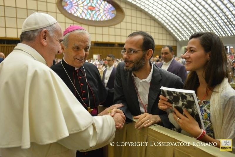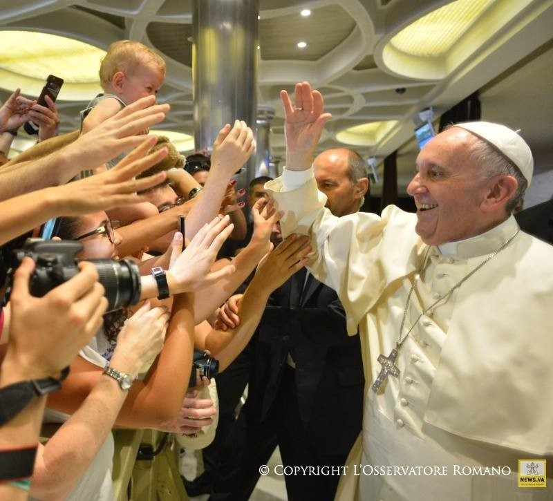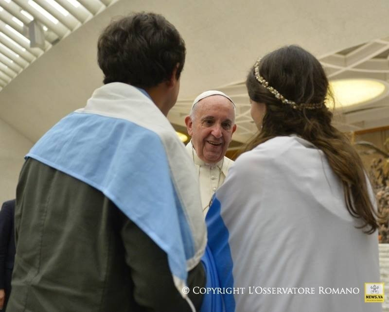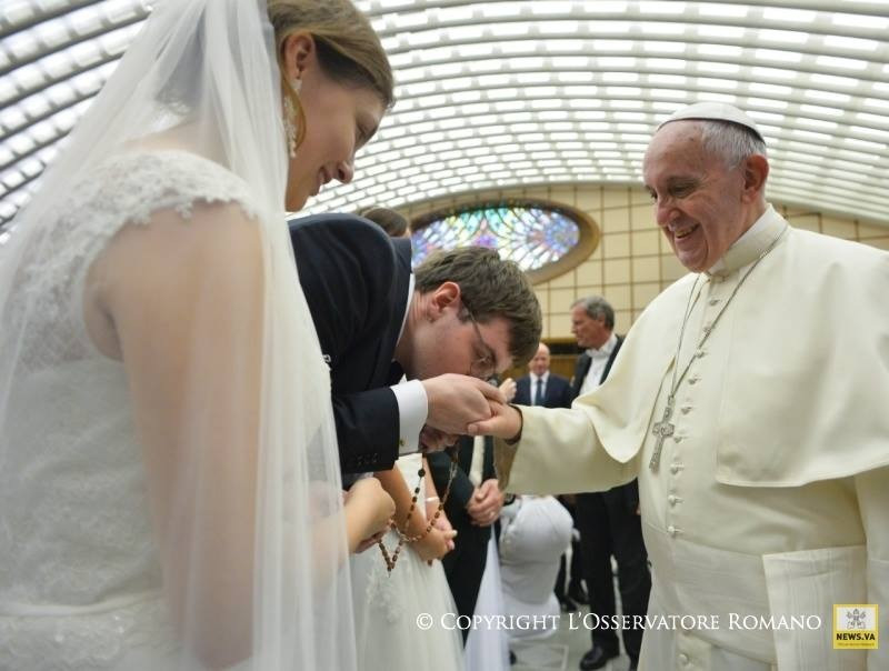 Az ünnep tehát nem azt jelenti, hogy lustán hátradőlünk a karosszékben vagy átadjuk magunkat a világtól való ostoba menekülés mámorának. Az ünnep mindenekelőtt az, hogy szeretettel és hálával végigtekintünk a jól végzett munkánkon, egy munkát ünnepelünk. Ti is, kedves ifjú házasok, a jegyesség szép időszakának munkáját ünneplitek, és ez szép dolog! Az ünnep az az idő, amikor valaki rátekint felcseperedő gyermekeire vagy az unokáira, és közben azt gondolja: milyen szép ez! Az ünnep az az idő, amikor végighordozzuk tekintetünket az otthonunkon, a vendégül látott barátainkon, a körülöttünk élő közösségen, és azt gondoljuk: milyen szép ez! Isten így tett, amikor a világot teremtette. És folyamatosan így tesz, mert Isten állandóan teremt, ebben a pillanatban is!