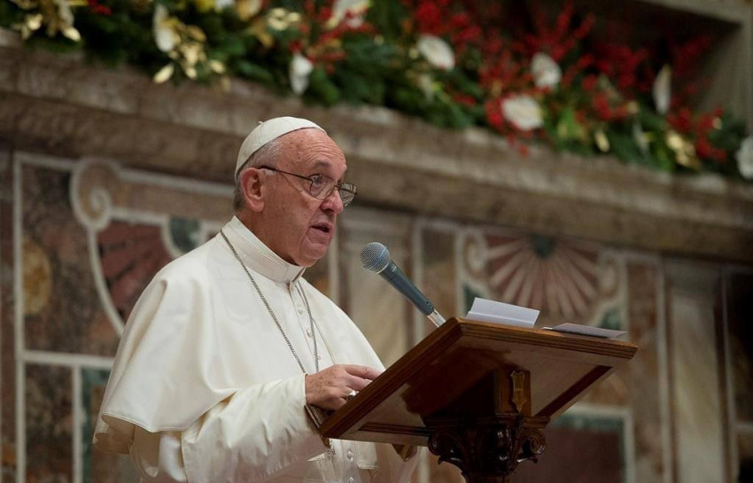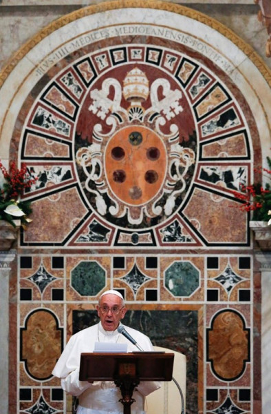 A pápa hosszú beszédében felsorolta az elmúlt év pozitív jeleit: az új diplomáciai kapcsolatok, illetve egyezmények születését a vallásszabadság és a kölcsönös párbeszéd bizonyítékaként. Visszatekintett apostoli útjaira, a családoknak szentelt világtalálkozóra és a püspöki szinódusra, az irgalmasság szentévének meghirdetésére, majd felszólalása nagy részében a migráció problémakörével foglalkozott.