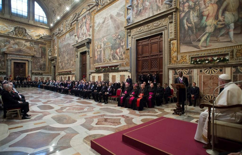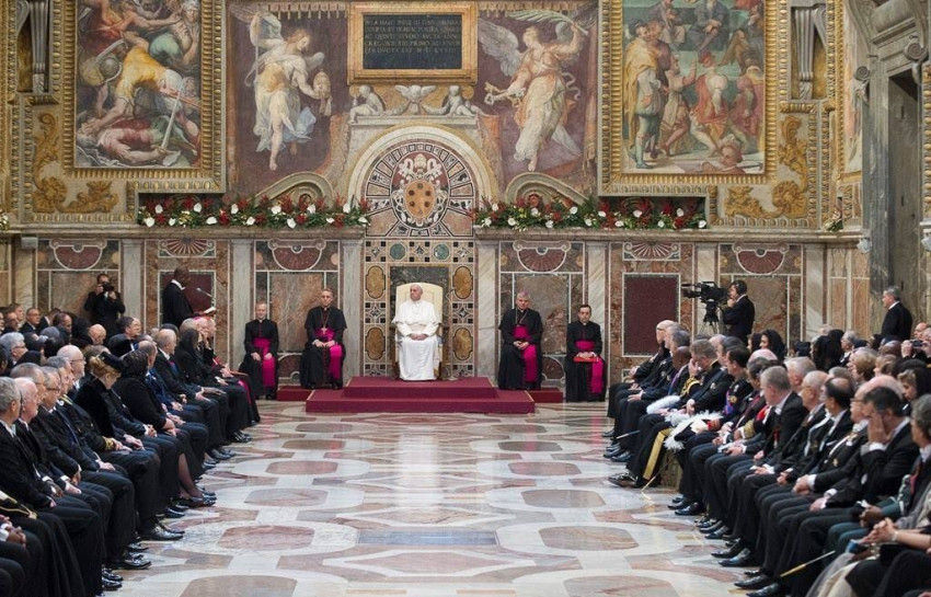 A Szentatya örömmel nyugtázta, hogy az elmúlt évben növekedett a szentszéki nagykövetek száma. A Vatikán jelenleg 180 állammal tart fönn diplomáciai kapcsolatokat. Több nemzetközi egyezményt aláírtak vagy ratifikáltak 2015-ben, amelyek közül a pápa kiemelte az Olaszországgal és az USA-val kötött pénzügyi megállapodást, mely arról tanúskodik, hogy a Szentszék elkötelezett a gazdasági kérdések áttekinthető kezelésére. Felsorolta még a Kelet-timori Demokratikus Népi Köztársasággal, Csáddal, Palesztinával és Kuvaittal megkötött egyezményeket. Mindez azt mutatja, hogy igenis lehetséges a különböző vallások közötti békés együttélés ott, ahol tiszteletben tartják a vallásszabadságot, és mindenki számára biztosítják a kulturális hovatartozás tiszteletét. Egyébiránt pedig minden hitelesen megélt vallás csak a békét szolgálhatja – fűzte hozzá a Szentatya.