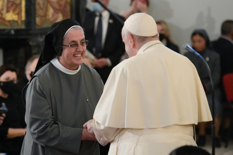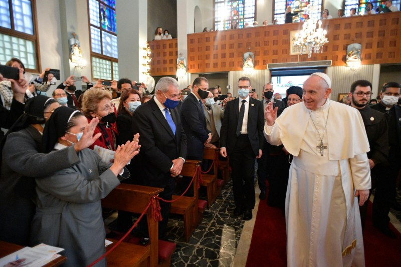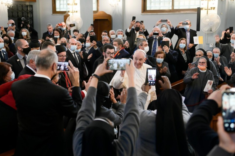 Örülök, hogy köztetek lehetek! Szeretnék köszönetet mondani Béchara Boutros Rai bíborosnak hozzám intézett szavaiért, és szeretettel köszöntöm Pierbattista Pizzaballa pátriárkát. Szeretnék köszönetet mondani mindnyájatoknak a szolgálatotokért; különösen nektek, nővérek, nevelő és oktató munkátokért az iskolákban, melyeket a sziget gyermekei igen gyakran látogatnak; ezek helyszínt biztosítanak nekik a találkozásra, a párbeszédre, a hídépítés művészetének elsajátítására. Köszönöm! Köszönöm mindnyájatoknak, hogy közel álltok az emberekhez, különösen a legnehezebb társadalmi és munkahelyi környezetekben.