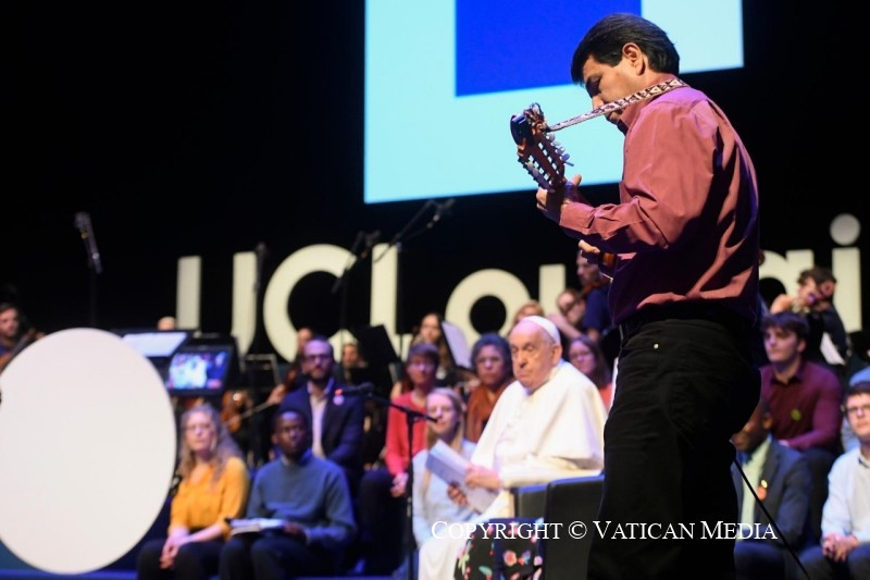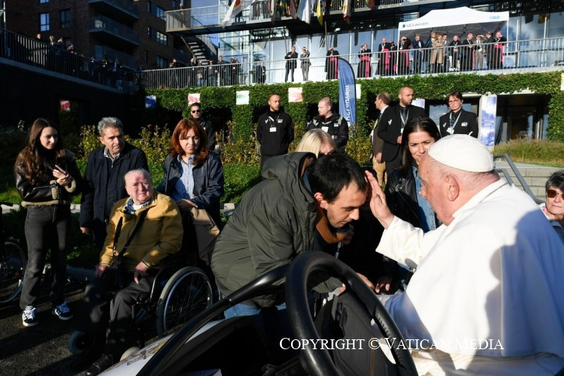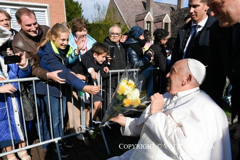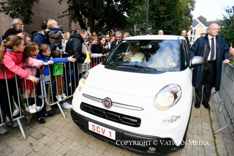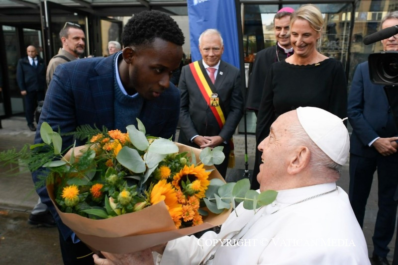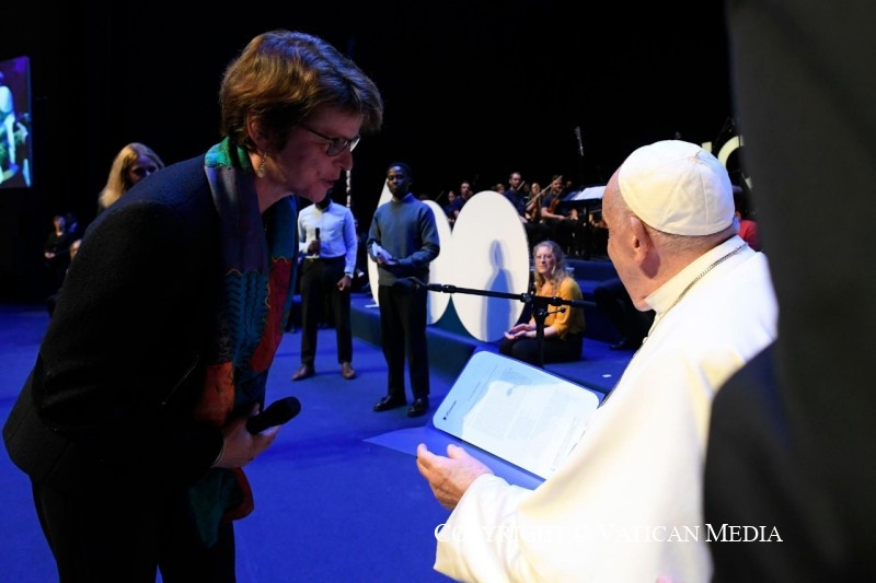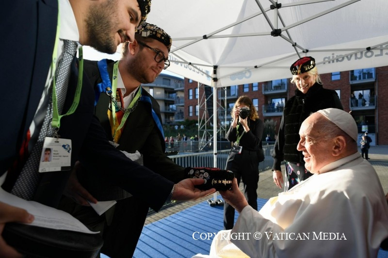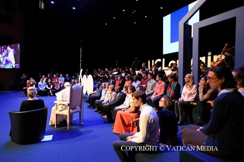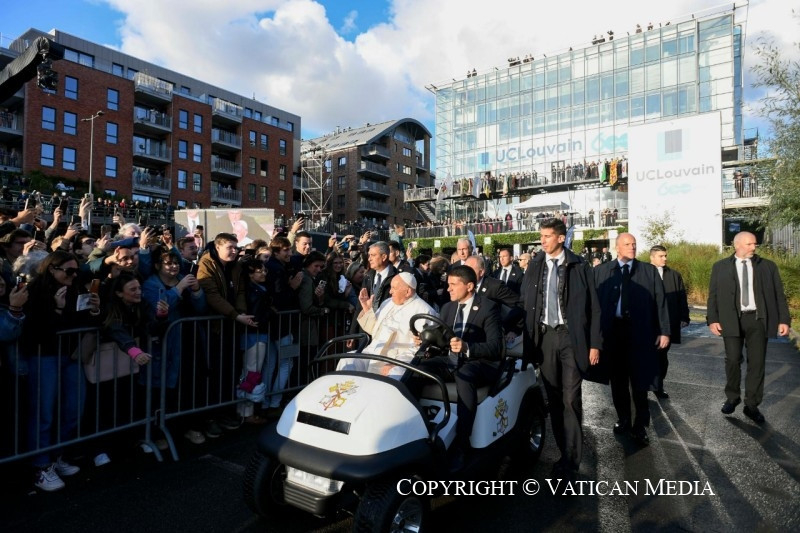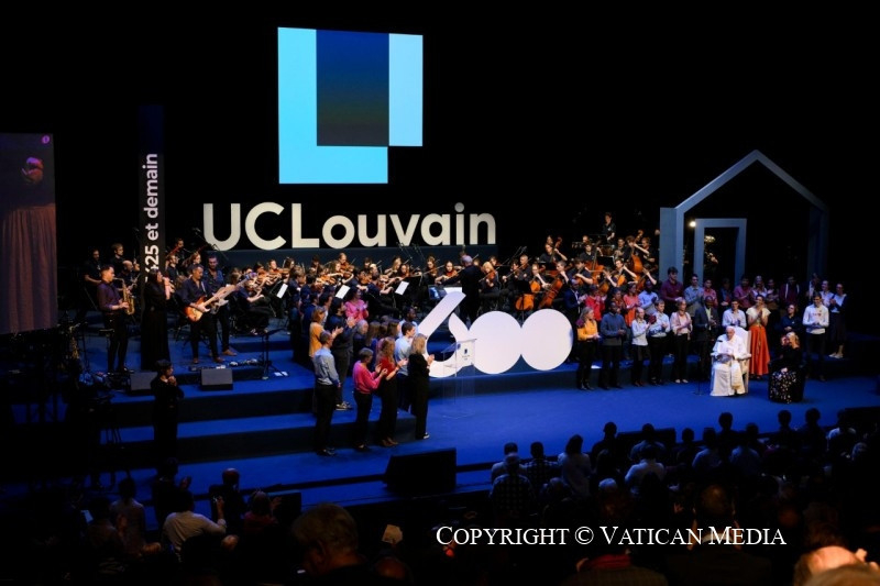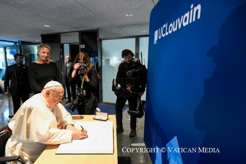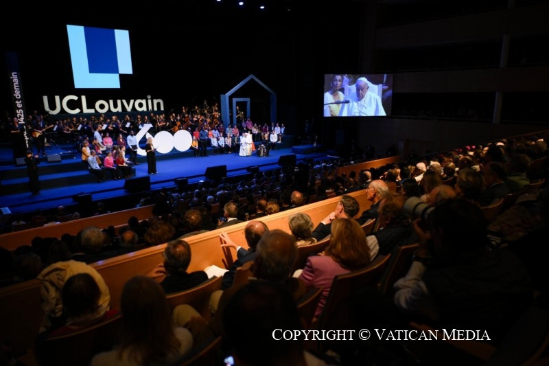 A vendégkönyv aláírása után Françoise Smets rektor köszöntette a pápát. Egy videó levetítése után felolvastak egy Ferenc pápának írt levelet, majd egy újabb videóvetítés után mondta el beszédét a Szentatya.