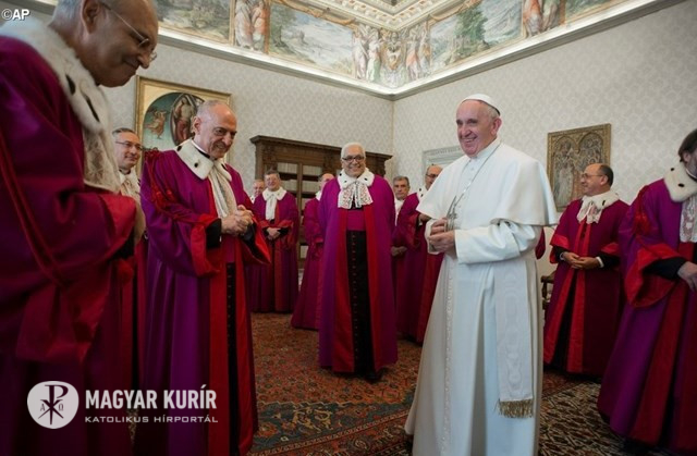 A családszinódus összefüggésében kollegiális jelleggel végezhettünk el egy bölcs megkülönbözetést, aminek következtében az egyház a világ felé jelezte, hogy nem lehet összekeverni az Istentől akart házasságot bármi másféle együttéléssel. Ezzel a spirituális és pasztorális hozzáállással a Rota Romana tevékenysége a bírói ítélkezésben és a képzésben az opus veritatis-t, az igazság művét szolgálja és mozdítja elő – hangsúlyozta a pápa.