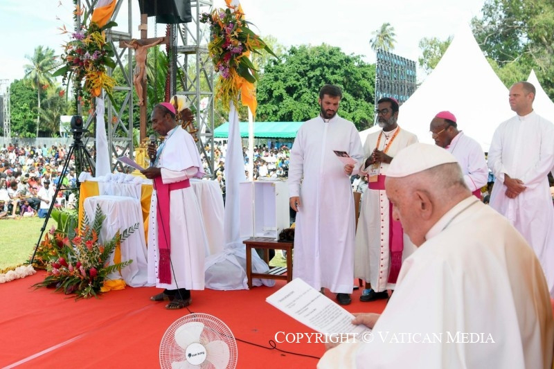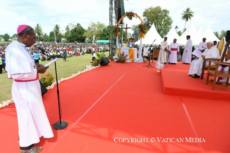 Köszönöm a püspök úr hozzám intézett szavait. Köszöntöm a hatóságokat, a papokat, a szerzetesnővéreket és a szerzeteseket, a misszionáriusokat, a katekétákat, a fiatalokat, a híveket – néhányan nagyon messziről jöttek – és titeket, kedves gyerekek! Köszönöm Maria Josephnek, Stevennek, Jaisha Joseph nővérnek, Davidnek és Mariának, amit megosztottatok. Örülök, hogy találkozhatom veletek ezen a csodálatos földön, ezen a fiatal és misszionáriusi földön!