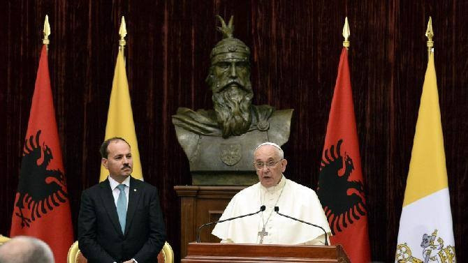 Különösen örvendek Albánia egy örömteli jellemvonásának, melyet nagy gonddal és figyelemmel kell őrizni: a különböző vallások követői közötti békés együttélésre és együttműködésre gondolok. Ez a kölcsönös tisztelettel és bizalommal teli hangulat katolikusok, ortodoxok és muzulmánok között nagyon értékes az ország számára, és különös jelentőséggel bír a mai világban, amikor különböző szélsőséges csoportok meghamisítják a hiteles vallásos érzéket. Az egyes vallások közötti különbségeket eltorzítják és kihasználják, veszélyes indítékot adva ezzel nézeteltérésekre és az erőszakra. És teszik mindezt ahelyett, hogy a különbségeket nyitott és tiszteletteljes párbeszédre hívó szóként élnék meg és keresnék az Istenben való hitről és törvényeinek követéséről szóló közös reflexió lehetőségét.