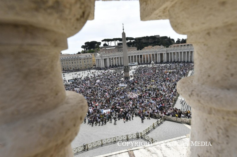 Szeretettel üdvözöllek mindnyájatokat, rómaiak, Olaszországból és sok más országból érkezett zarándokok. Számos ország zászlaját látom. Külön is köszöntöm a salamancaiakat és az albacetei diákokat, valamint a Máltai Lovagrend Segélyszervezetének veneto-trentinói csoportját. Üdvözlöm Ferrara, Palermo és Grumello del Monte híveit; a lodi egyházmegyei iskola közösségét; az albai, bergamói, bresciai, comói és milánói egyházmegye városainak fiataljait; számos olasz egyházközség bérmálkozóit; a cadoneghei Sacro Cuore Intézet diákjait; a casoli „Volœntieri” munkaközösséget és az agnai „Mototurismo” csoportot.