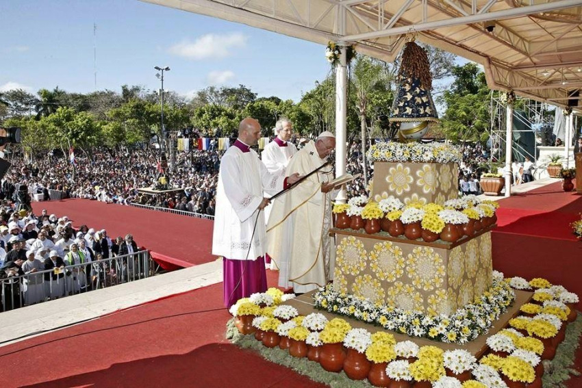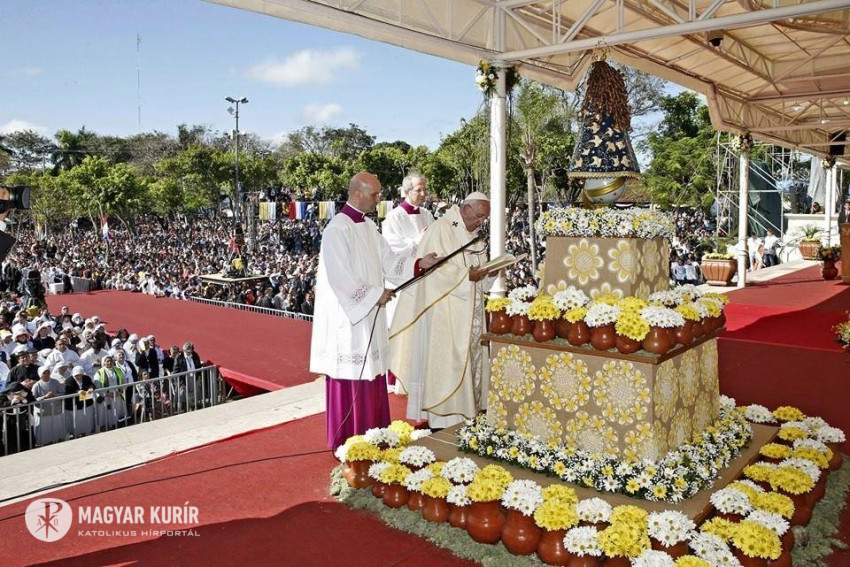 Mária megtanított bennünket, hogy minden helyzetben, számtalan nehézség közepette is az Úr velünk van, miként az angyali üzenet szerint ővele volt: „Az Úr van teveled! Ne félj, Mária!” És Mária mindig azt mondja, amit a kánai menyegzőn: „Tegyétek, amit mond!” Ferenc pápa szó szerint így folytatta: „Ti tudjátok, megtapasztaltátok, amit most megosztunk. Ti valamennyien, minden paraguayi elevenen emlékezik arra a népre, amely megtestesítette az evangéliumnak ezeket a szavait. És különösen is utalni akarok rátok, asszonyokra és paraguayi anyákra, akik nagy bátorsággal és önmegtagadással talpra tudtátok állítani a háború által lerombolt, mélyre süllyedt országot. Nálatok van az emlékezet, a genetikai öröksége azoknak, akik újraépítették az életet, a hitet, népetek méltóságát.