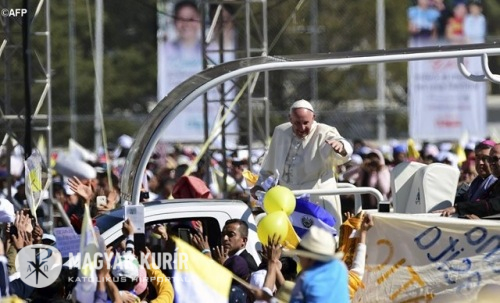 A tömeg folyamatos kiáltásokkal üdvözölte a Szentatyát érkezésekor: Üdvözlünk Ferenc pápa! Üdvözlünk az igazság pápája! Üdvözlünk a béke pápája! Üdvözlünk a szegények pápája!