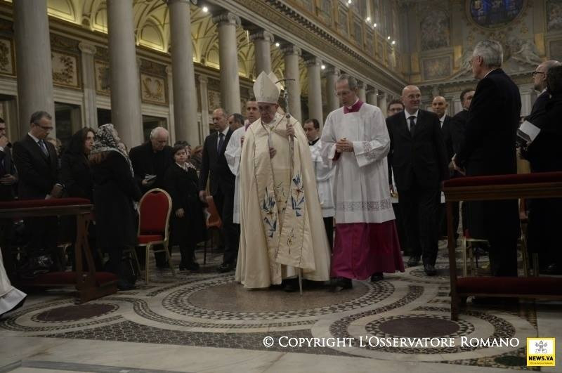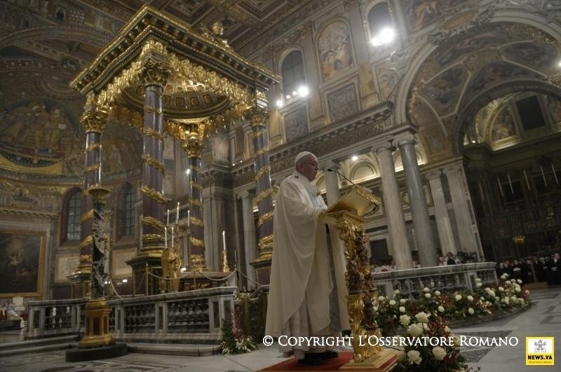 Ezekkel az üdvözlő szavakkal szeretnénk Szűz Máriához fordulni a neki szentelt római bazilikában, mely Isten anyjáról van elnevezve. Egy ősi himnusz kezdődik így, amelyet a szentmise végén fogunk elénekelni; nem ismerjük a szerzőjét; a hívők szívéből ösztönösen születő imádságként érkezett hozzánk: „Üdvöz légy, irgalmasság anyja, Isten anyja, a megbocsátás anyja, a remény anyja, a kegyelem anyja, szent örömmel telt anya!” E néhány szó nemzedékek hitét foglalja össze, akik Szűz Mária ikonjára szegezik tekintetüket, akik az ő közbenjárását és vigasztalását kérik.