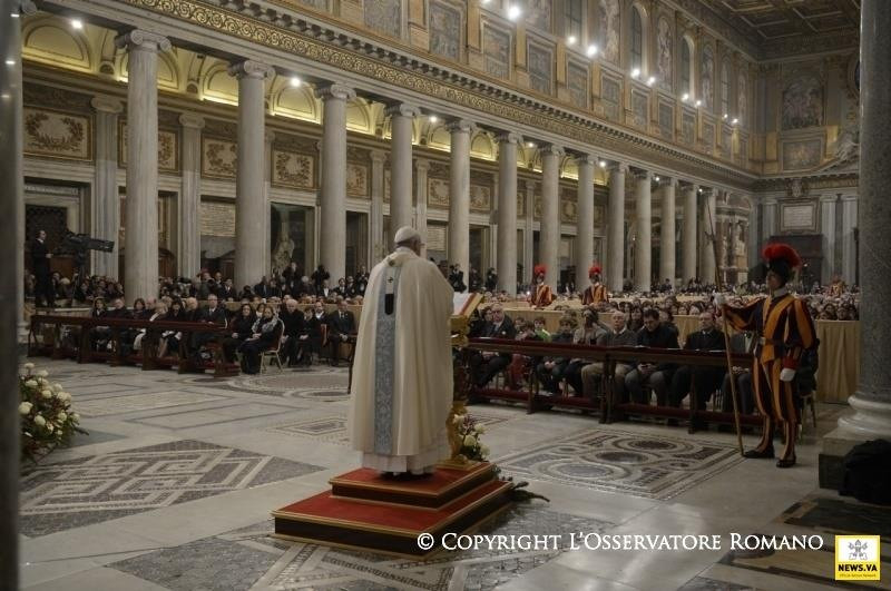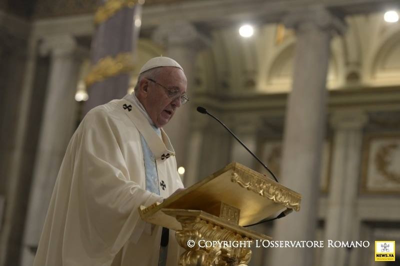 Sosem volt alkalmasabb, mint éppen ma, hogy Szűz Máriát az irgalmasság anyjaként szólítsuk meg. A szent kapu ugyanis, melyet megnyitottunk, valóban az irgalmasság kapuja. Bárki átlépi azt a küszöböt, meghívást kap, hogy megfürödjön az Atya irgalmas szeretetében, teljes bizalommal, minden félelem nélkül; és azzal a bizonyossággal indulhat útjára ebből a bazilikából, hogy Mária ott lesz mellette útitársként. Ő az irgalmasság anyja, mert magának az isteni irgalmasságnak az arcát foganta és hordozta méhében, Jézust, az Emmánuelt, akire a népek vártak, a „béke fejedelmét” (Iz 9,5). Isten Fia, aki testté lett a mi üdvösségünkért, nekünk adta anyját, aki velünk együtt zarándokol, hogy sose hagyjon magunkra életünk útján, főként a bizonytalanság és a fájdalom időszakaiban.