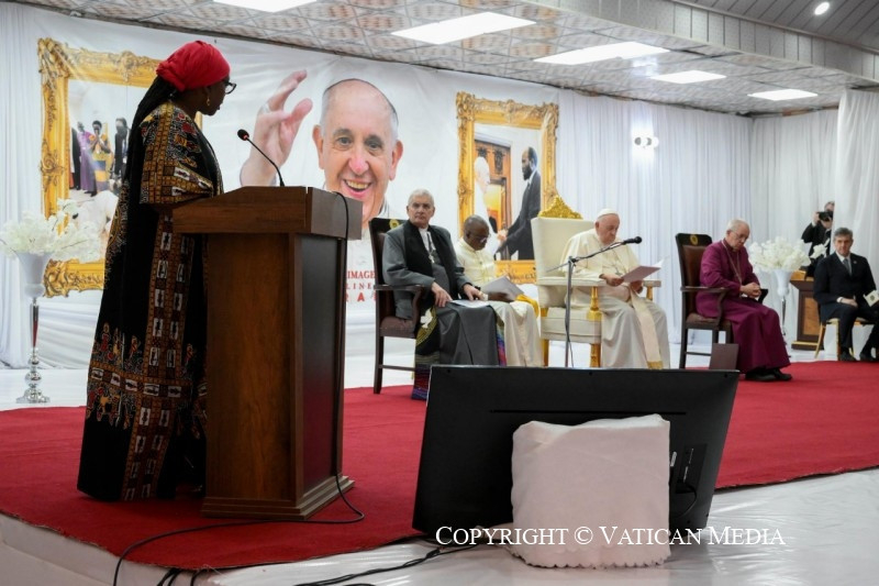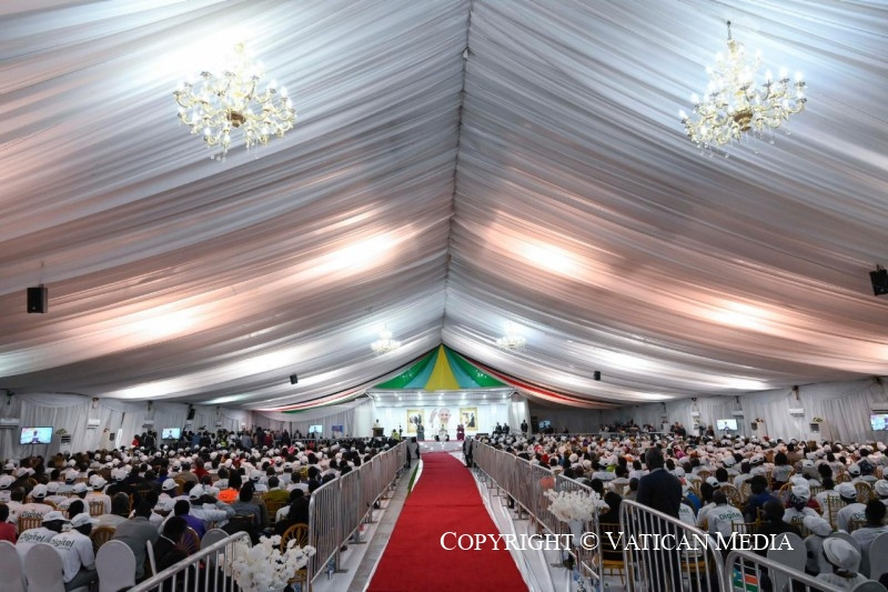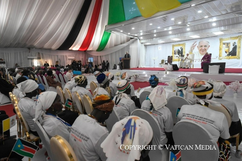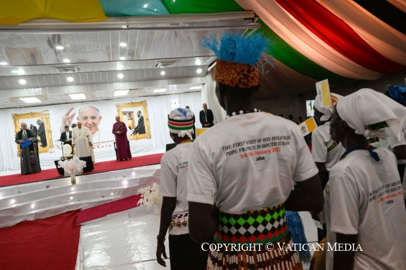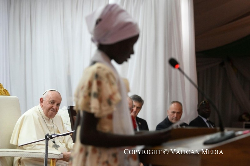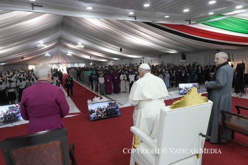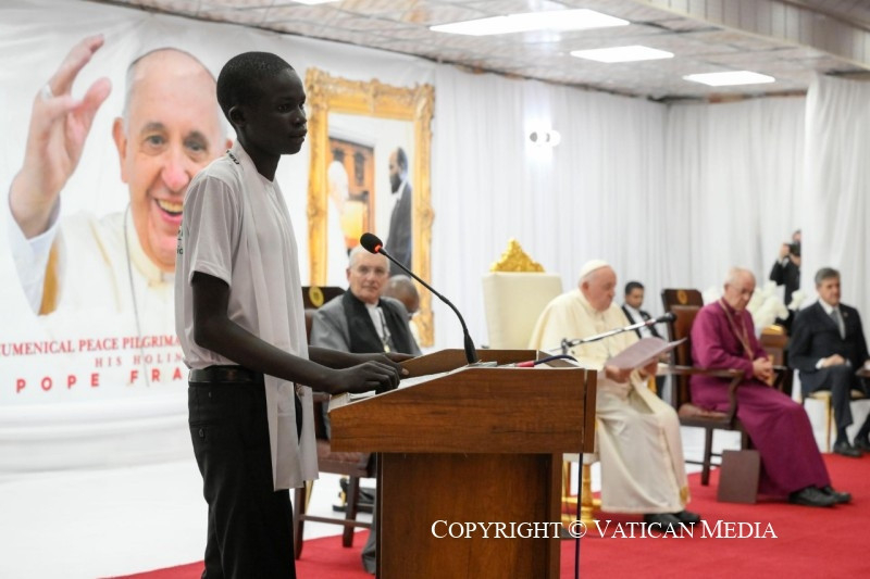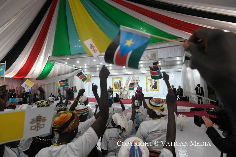 Azt szeretném mondani nektek: ti vagy az új Dél-Szudán magja, az ország termékeny és virágzó növekedésének magja. Ti vagytok azok, az összes különböző etnikai csoportot képviselve, akik szenvedtetek és szenvedtek, de akik nem akartok a rosszra újabb rosszal válaszolni. Ti, akik mostantól a testvériséget és a megbocsátást választjátok, egy jobb holnapot ápoltok. Olyan holnapot, amely ma születik, ott, ahol ti vagytok, abból a képességből, hogy együttműködtök, hogy a közösségvállalás szálait szőjétek és a megbékélés útjait járjátok azokkal, akik etnikai és származási szempontból különböznek tőletek, de mellettetek élnek. Testvéreim és nővéreim, legyetek a remény magjai, melyekben már megpillantható a fa, amely egy napon, remélhetőleg nemsokára, gyümölcsöt terem. Igen,