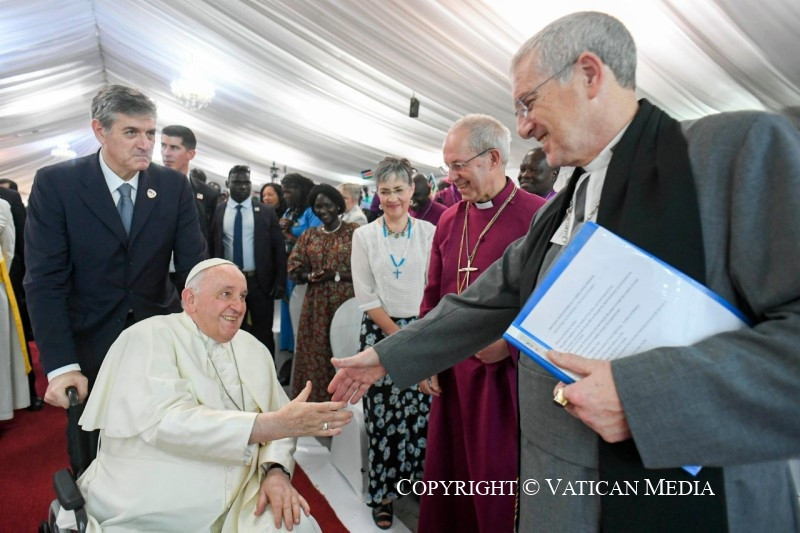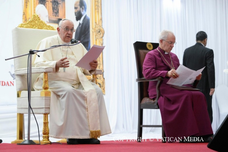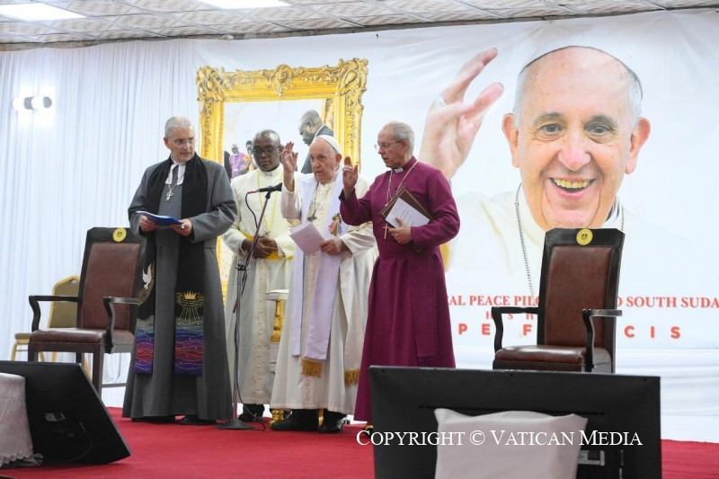 Végezetül szeretnék szólni ahhoz a sok dél-szudáni menekülthöz, akik az országon kívül vannak, és akik nem térhetnek vissza, mert területüket elfoglalták. Közel állok hozzájuk, és kívánom, hogy ismét földjük jövőjének főszereplőivé válhassanak, konstruktív és békés módon hozzájárulva annak fejlődéséhez. Nyakuor Rebecca, különleges áldást kértél tőlem a dél-szudáni gyermekekre, hogy mindannyian békében együtt növekedhessetek. Mi, hárman, mint testvérek fogjuk az áldást adni: Justin testvéremmel és Iain testvéremmel együtt fogjuk adni az áldást. Ezzel az áldással együtt a világ megannyi keresztény testvérének és nővérének áldása szálljon le rátok, akik ölelnek és bátorítanak benneteket, tudva, hogy bennetek, hitetekben, belső erőtökben, békeálmaitokban az emberlét egész szépsége ragyog fel.