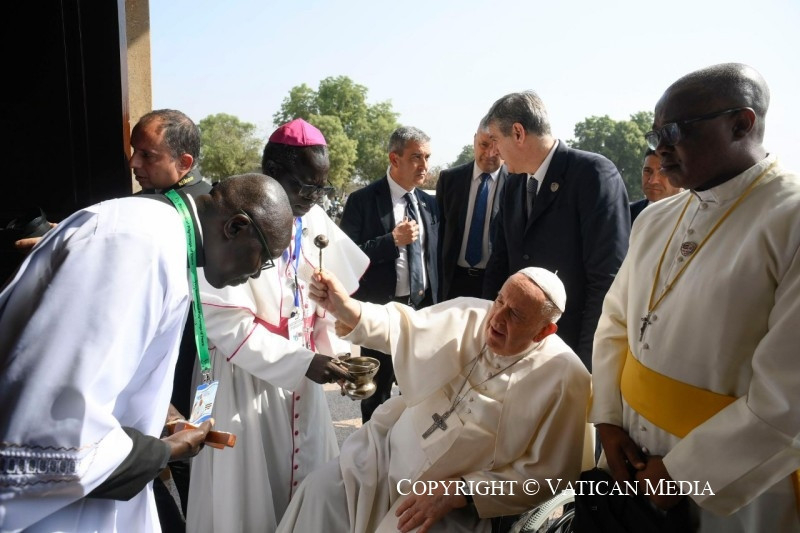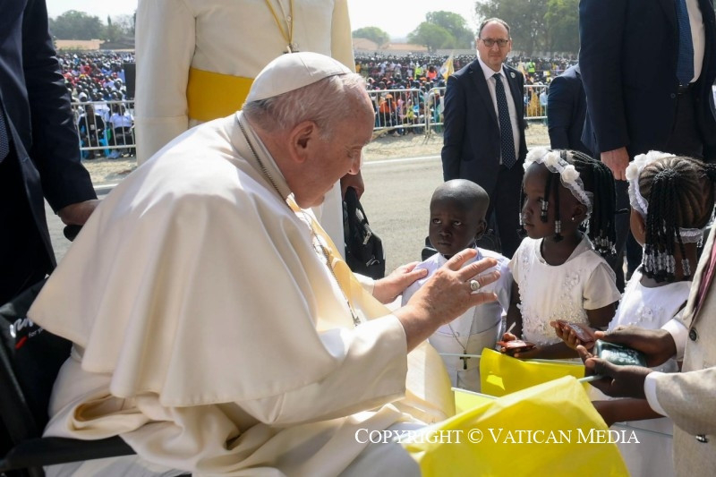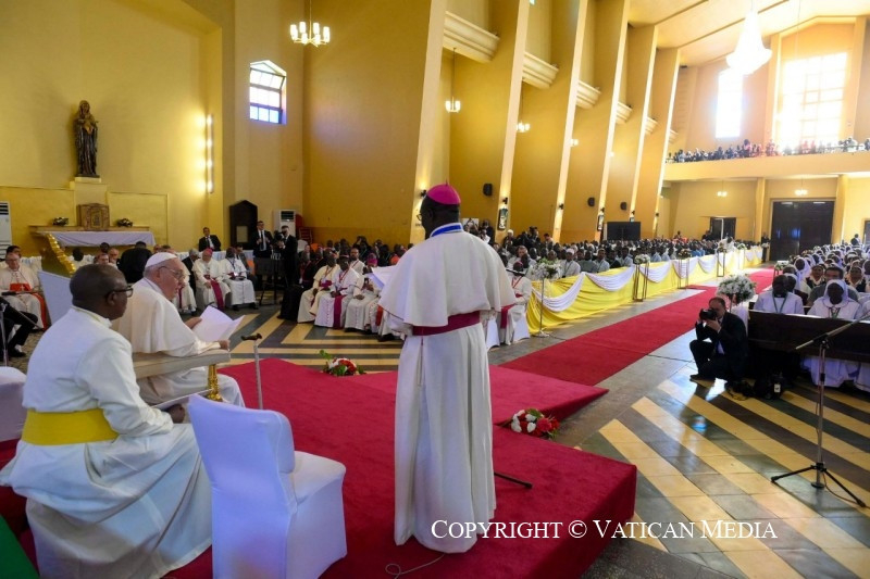 Hosszú ideje élt bennem a vágy, hogy találkozzam veletek; ezért ma szeretnék hálát adni az Úrnak. Hálás vagyok Tombe Trille érsek úrnak a köszöntésért, és mindnyájatoknak a jelenlétetekért és az üdvözlésetekért. Némelyek napokat utaztak, hogy ma itt lehessenek! Mindig szívemben hordozok néhány pillanatot, amelyet e látogatás előtt éltem át: a 2017-ben a Szent Péter-bazilikában tartott misét, amelyen Istenhez könyörögtünk a béke ajándékáért; és a 2019-es lelki lelkigyakorlatot a politikai vezetőkkel, akiket azért hívtam meg, hogy az ima által a szívükbe zárják azt a szilárd elhatározást, hogy a megbékélésre és a testvériségre törekszenek az országban. Mindenekelőtt erre van szükségünk: befogadni Jézust, a mi békénket és reménységünket.