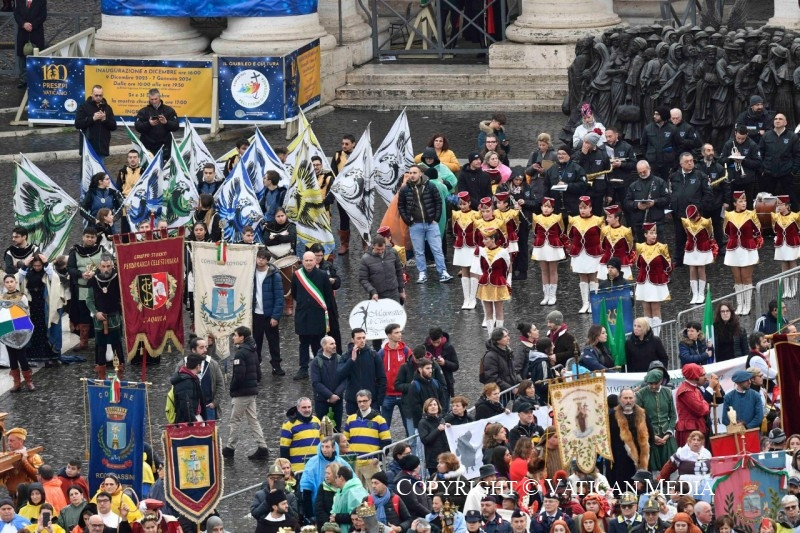 Köszöntöm a Németországból érkezett híveket, a „Tra Noi” Mozgalom fiataljait, a carovilli „a történelem és a hagyományok barátai” csoportot, a Paderno Franciacorta-i AVIS csoportot. Áldásomat kiterjesztem azokra is, akik részt vesznek a háromkirályok nagy felvonulásán Varsóban és Lengyelország számos városában.