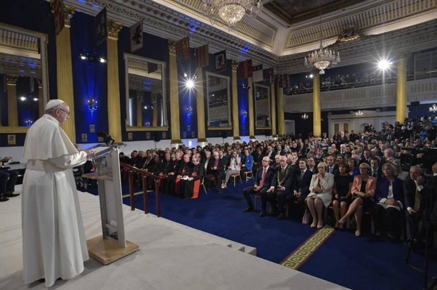 A pápa köszöntötte a civil, a kulturális és a vallási élet képviselőit, a diplomáciai testület tagjait és a vendégeket. Nagyra értékelte Írország elnöke részéről a baráti fogadtatást, amely tükrözi az írek világszerte közismert szívélyes vendéglátásának hagyományát, továbbá örömét fejezte ki az Észak-Írországból érkezett küldöttség jelenléte miatt.