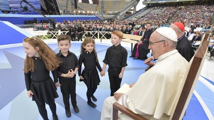 Minden családi ünnepen megfigyelhető, hogy ott van mindenki: apák, anyák, nagyszülők, unokák, nagybácsik és nagynénik, unokatestvérek, és valamiképpen azok is jelen vannak, akik nem tudtak elmenni, és akik túl messze laknak; mindenki. Ma Dublinban családi ünnepre gyűltünk egybe, hogy hálát adjunk Istennek azért, amik vagyunk: az egész földet behálózó egyetlen család Krisztusban. Az Egyház Isten gyermekeinek a családja. Olyan család, amelyben együtt örülünk az örvendezőkkel, és együtt sírunk azokkal, akiket lesújt a fájdalom, vagy úgy érzik, hogy az élet padlóra küldte őket. Olyan család, amelyben mindenkivel törődünk, mert Isten, a mi Atyánk valamennyiünket az ő gyermekévé tett a keresztségben. Ezért buzdítom állandóan a szülőket, hogy amint lehetséges, kereszteltessék meg gyermekeiket, hogy azok Isten nagy családjához tartozzanak. Mindenkit hívni kell az ünnepre, a legkisebb csöppséget is! Ezért kell korán megkeresztelni. Van egy másik szempont is: ha a gyermeket már kisgyermekkorában megkeresztelik, beköltözik szívébe a Szentlélek. Hasonlítsuk össze: van egy keresztség nélküli gyermek, mert a szülei azt mondják: „Most nem kereszteljük meg, hanem majd akkor, ha nagy lesz”; és van a megkeresztelt gyermek, szívében a Szentlélekkel: emez erősebb, mert belül magában hordozza Isten erejét!