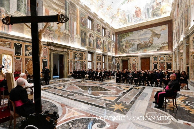 A pápa arra buzdította a küldöttség tagjait, hogy minden tevékenységüket Krisztus és az Anyaszentegyház tagjaként végezzék. Hangsúlyozta, hogy konkrétan hozzá kell járulnunk az Egyház missziós és evangéliumi küldetéséhez, amely a hitből és a szeretetből nyer ösztönzést. Ferenc pápa arra kérte az egyetem képviselőit, hogy „az Egyház szívéből kiindulva végezzék tevékenységüket”, hogy „olyan embereket képezzenek, akik képesek elfogadni Istent, és bármely területen tanúságot tenni róla, valamint akik képesek olyan testvéri társadalmat építeni, amelyben az Egyházat tagjainak jó cselekedetei által tapasztalják meg”.