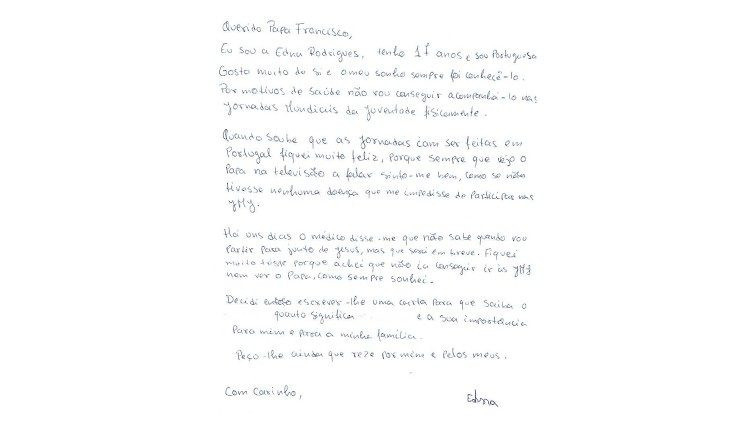 „Amikor meghallottam, hogy az ifjúsági világtalálkozót Portugáliában tartják, nagyon boldog voltam, mert valahányszor látom a pápát beszélni a televízióban, jól érzem magam, mintha nem lenne olyan betegségem, amely megakadályozná a világtalálkozón való részvételemet” – mutatott rá Edna a levélben. Hozzátette, írni akart Ferenc pápának, hogy tudja, személye „milyen fontos számomra és a családom számára”.
