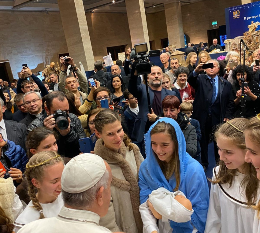 A Szentatya december 9-én délután érkezett a tárlatra, ahol a betlehemek készítőivel találkozott. Rino Fisichella érsek fogadta a pápát, körbevezette a kiállított betlehemek között. Ferenc pápa elbeszélgetett az alkotókkal. Közben a budapesti Kodály Zoltán Magyar Kórusiskola Sapszon Borbála vezette kamarakórusa magyar karácsonyi énekeket énekelt.