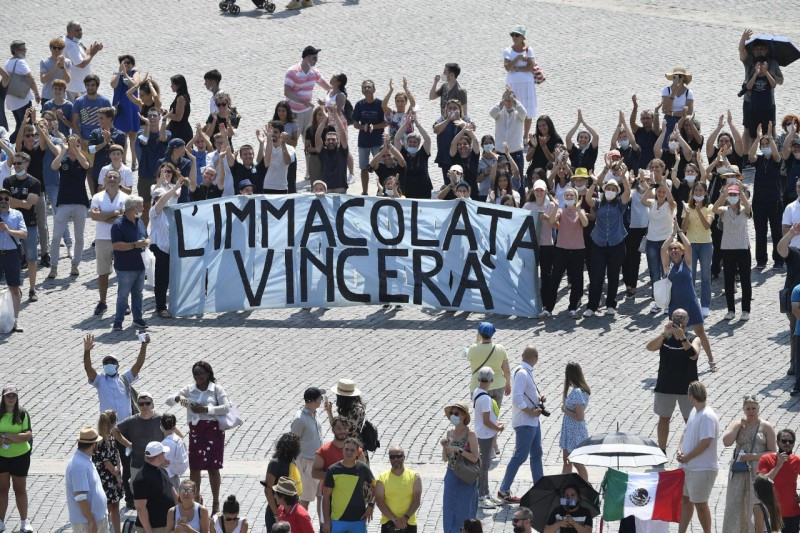 Ezen a vasárnapon is örömmel köszöntöm a fiatalok különböző csoportjait: a Cornudából, Covolo di Piavéból és Nogaréból, a trevisói egyházmegyéből jött fiatalokat, a milánói Rogoredóból, a Dalménéből, a Cagliariból, a Verona melletti Pescantinából érkezett fiatalokat, valamint a mantovai cserkészek csoportját. Kedves fiúk és lányok, sokan részesültek közületek egy hosszú közös út élményében: segítsen ez benneteket abban, hogy az életben az evangélium útján járjatok! És köszöntöm a Szeplőtelen Fogantatás plébániájának fiataljait is.