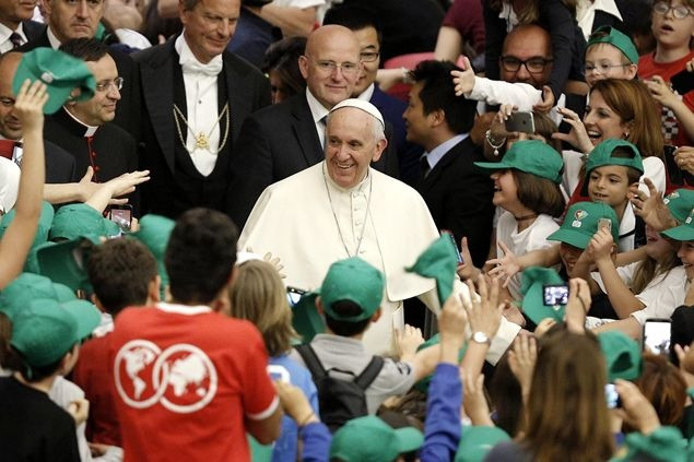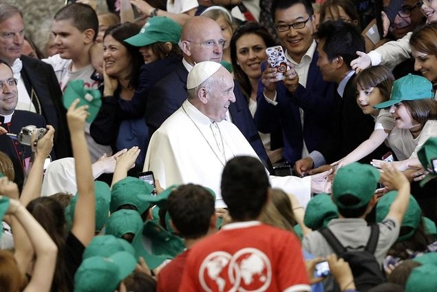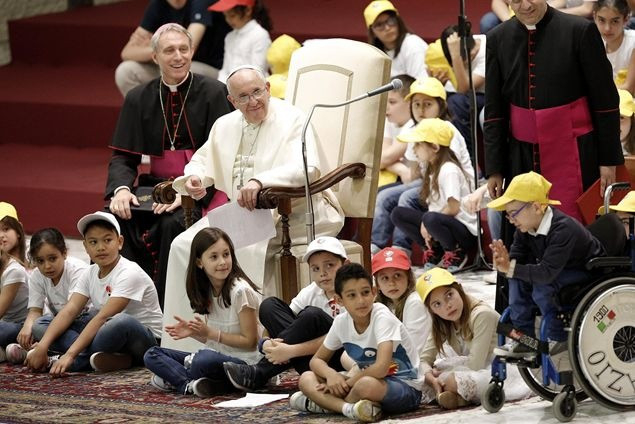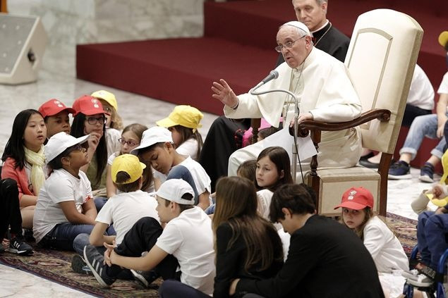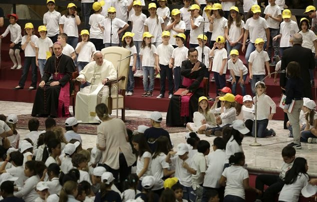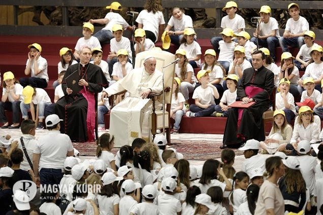 „A béke és a háború házát mindennap építik. Egy nagy különbséggel: az egyik kézműves műhely, a másik ellenben ipar. Az első a testvériség és a befogadás gesztusaival fordul az ember felé, a másik viszont bántja, mert haszonleső, és pénzt akar” – ezekkel a szavakkal fordult a pápa a gyerekekhez, akik a VI. Pál-teremből egyetlen hatalmas iskolai zsibongót teremtettek pillanatok alatt, zenéjükkel és lelkesedésükkel. Ferenc pápát azonnal maguk közé fogadták, a béke munkásaként fehér munkavédelmi sisakot húztak a fejére, majd kérdéseikkel ostromolták.
