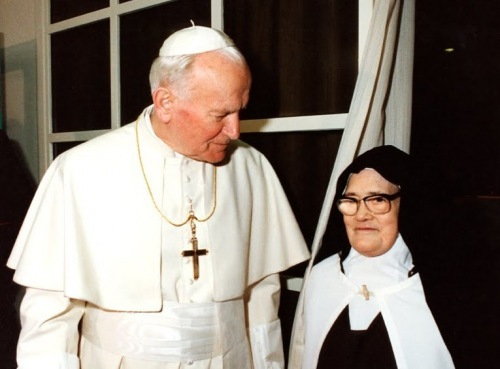 A kiemelkedő jelentőségű fatimai kegyhelyet három pápa is felkereste már: először Boldog VI. Pál pápa 1967-ben, a II. vatikáni zsinat után két évvel. Szent II. János Pál (képünkön az egyik látnokkal, Lúcia nővérrel látható) háromszor is járt ott: 1982-ben, 1991-ben és 2000-ben. XVI. Benedek tíz évvel később, 2010-ben látogatott el a Fatimai Szűzanyához.
