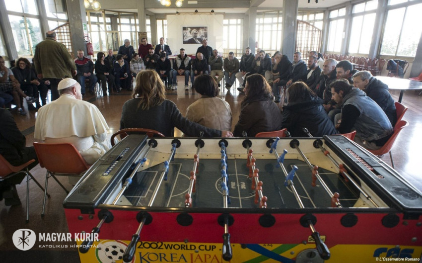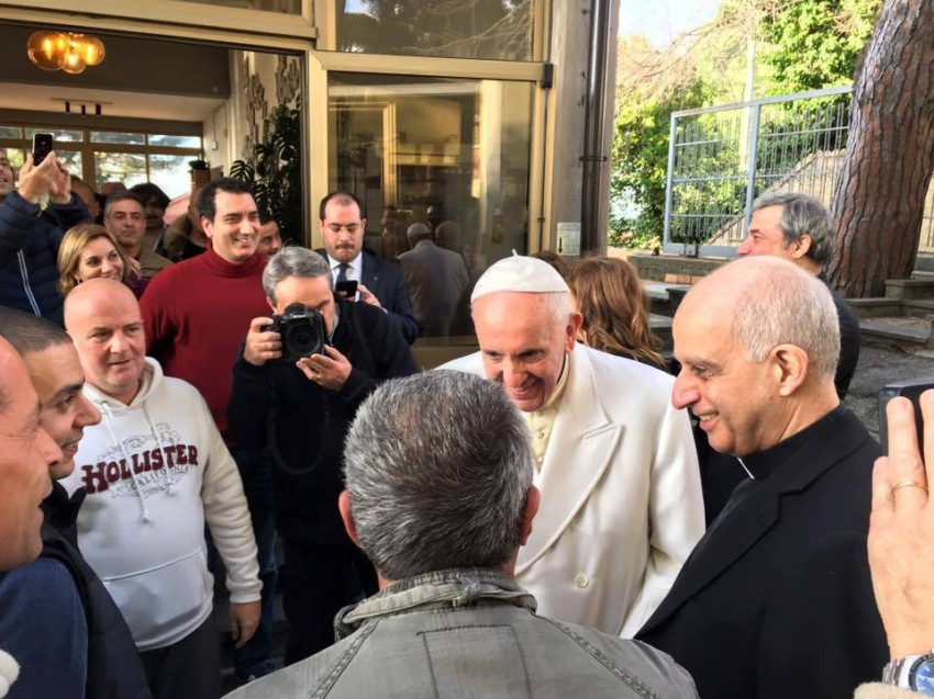 Ez a pénteki látogatás is meglepetés volt. A pápa hivatalos kíséret nélkül érkezett a San Carlo-segítőközpontba. Egyedül Rino Fisichella érsek, az Új Evangelizáció Pápai Tanácsának elnöke kísérte el. A gondozott fiatalok éppen délutáni megszokott közösségi tevékenységüket végezték kisebb csoportokban, amikor egyszer csak megjelent közöttük Ferenc pápa.