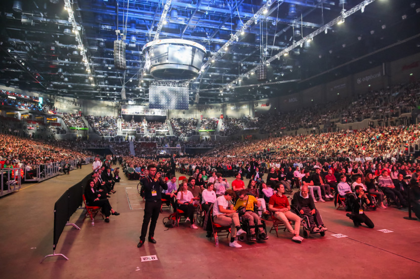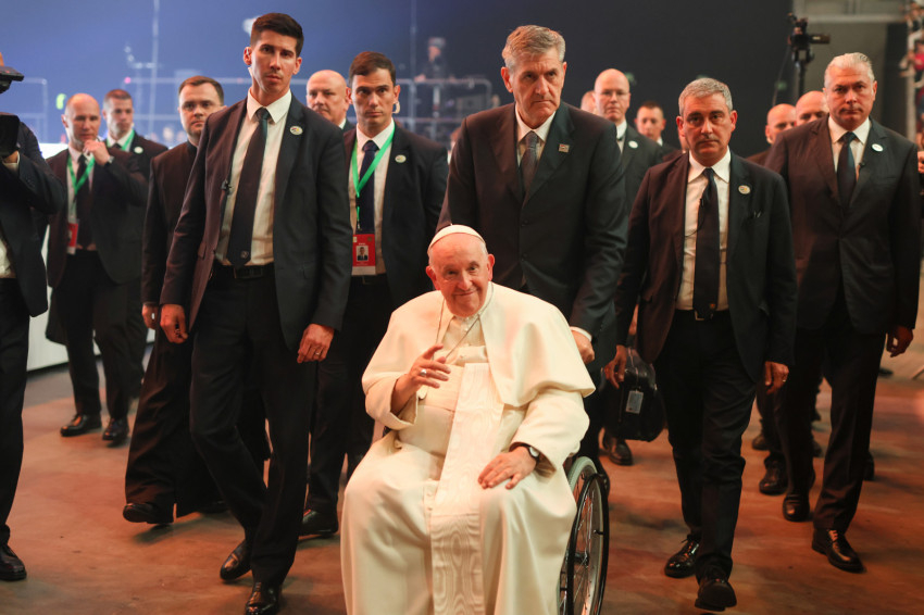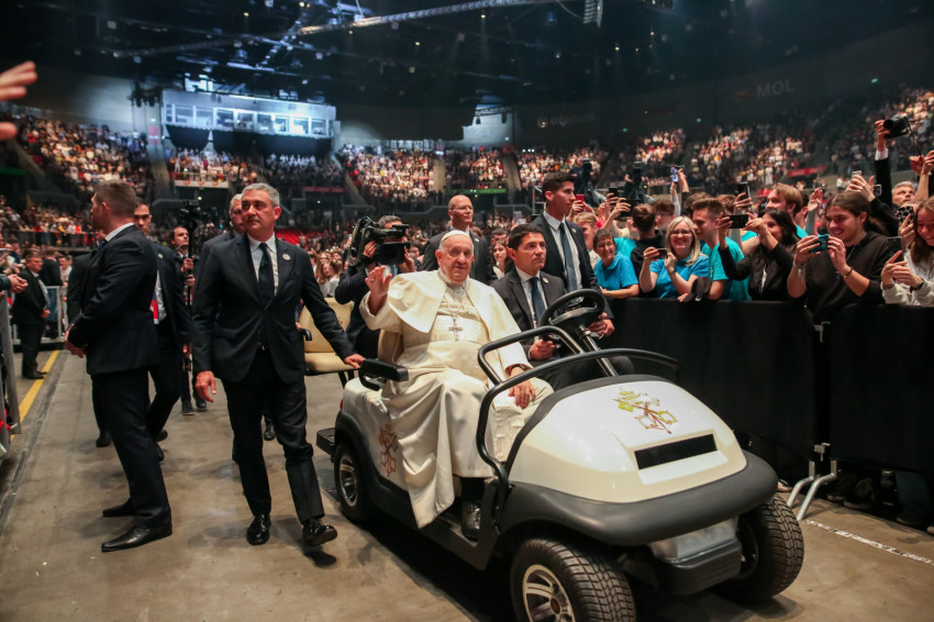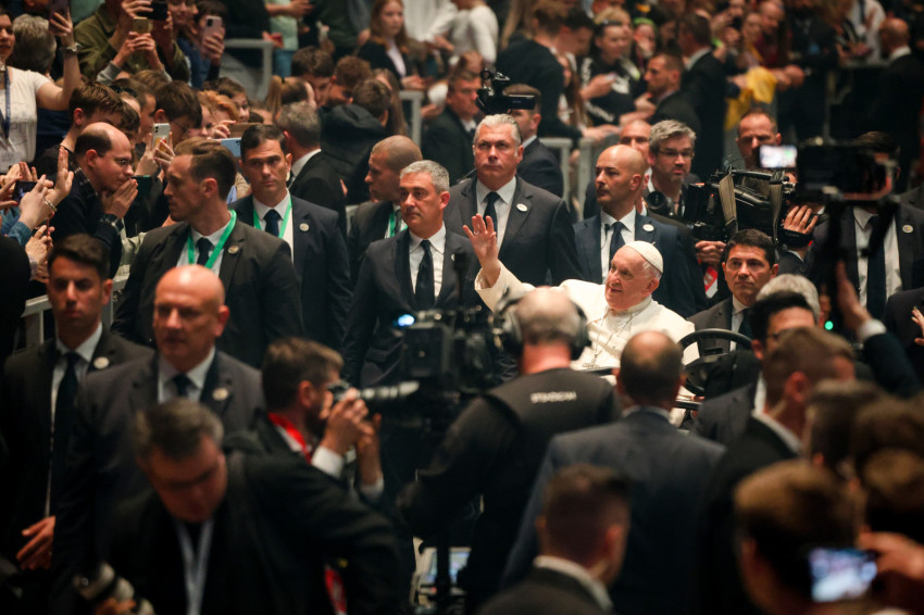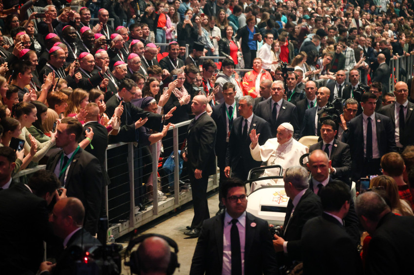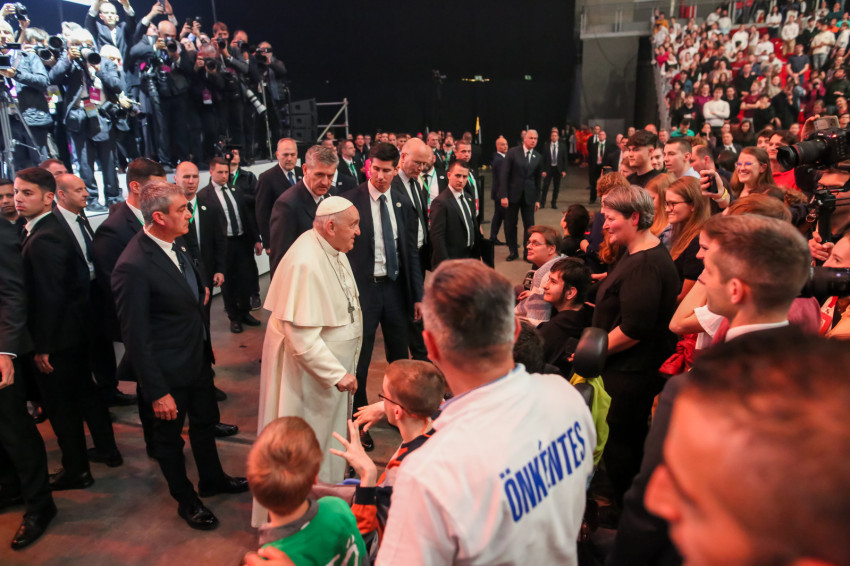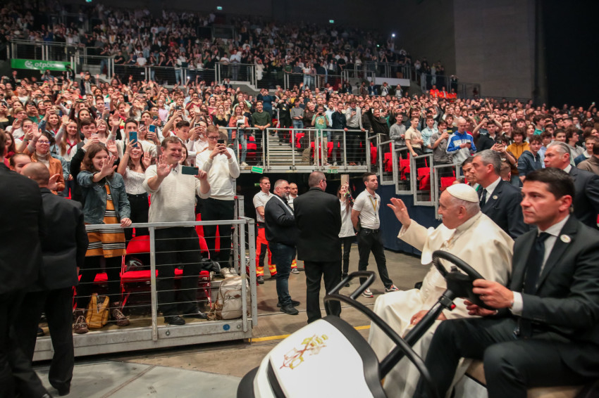 Ferenc pápa korábban érkezett meg a Papp László Sportarénába, ahol óriási lelkesedéssel, tapssal fogadták.