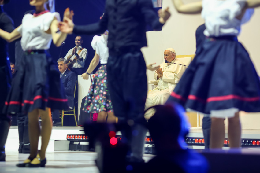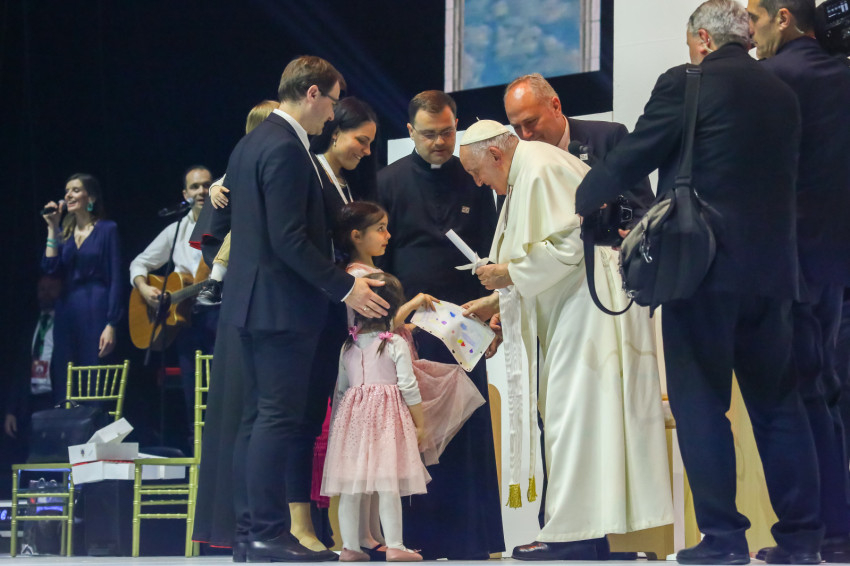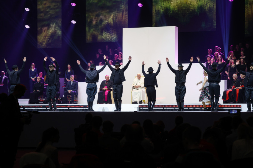 Rövid néptáncbemutatót követően fiatalok tettek tanúságot a hitükről a pápa előtt. Mindannyiuk beszédét lelkesen üdvözölte az arénát megtöltő 11 ezer résztvevő, többször tapssal szakítva meg szavaikat, biztatva a tanúságtevőket.