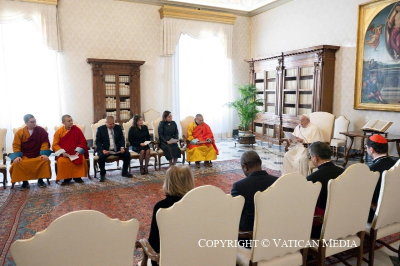 A pápa felidézte a 2023. szeptember 3-i találkozót, amelyen tizenegy különböző vallású vezető vett részt. Akkor fontos szavakat mondott a vallások szolgálatáról a jó érdekében, és azt ajánlotta, hogy ne keverjük össze a hitet az erőszakkal. Ferenc pápa arra emlékeztette a buddhista küldöttséget, hogy azon a napon a különböző vallások képviselőivel „minden férfi és nő mélységes lelki vágyakozásán elmélkedtünk, amelyet a testvérek nagy szövetségéhez hasonlíthatunk, akik az égre szegezett tekintettel haladnak előre az életben”. A pápa ezután vendégeit úgy üdvözölte, mint „mindannyiótok testvére, közös vallási keresésünk nevében”.
