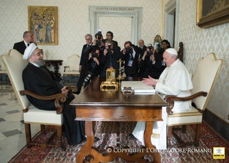 „Nagyon köszönöm a látogatását, és reménykedem a békében” – ezekkel a szavakkal búcsúzott Ferenc pápa az iráni elnöktől a vatikáni audiencia végén. „Igazán nagyon örültem a találkozásnak, jó munkát kívánok” – hangzott Rohani elnök válasza. Hosszú, negyvenperces magánmegbeszélést folytattak zárt ajtók mögött, amelynek végén Rohani elnök kérte a pápát, hogy imádkozzon érte.