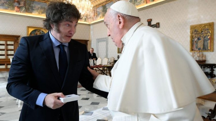 Javier Milei 2023 decembere óta Jorge Mario Bergoglio szülőföldje, Argentína elnöke, akit a pápa február 12-én magánkihallgatáson fogadott a Vatikánban. Honfitársa tipikus argentin édességekkel kedveskedett neki, csokoládés töltött kekszet (alfajores) és karamellkrémet (dulce de leche) hozott ajándékba, tudva, hogy a pápa kedvencei.