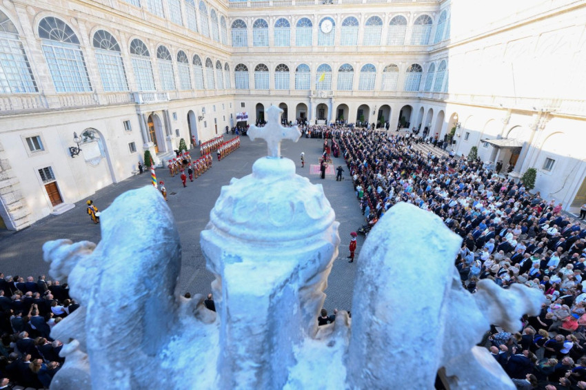A Szentatya örömmel üdvözölte a gárdistákat az Apostoli Palotában, amelyet jól ismernek, hiszen ott végzik értékes munkájukat. Név szerint köszöntötte a gárdaparancsnok Christoph Graf ezredest és Kolumban Reichlin káplánt, a tiszteket, altiszteket, a gárdistákat, családtagjaikkal együtt. Külön üdvözölte a pápa az új gárdistákat és rokonaikat, akik az eskütétel ünnepére érkeztek, örömmel köszönte meg az újoncok elkötelezettségét, amivel a Péter-utód iránti hűségükről tanúskodnak.